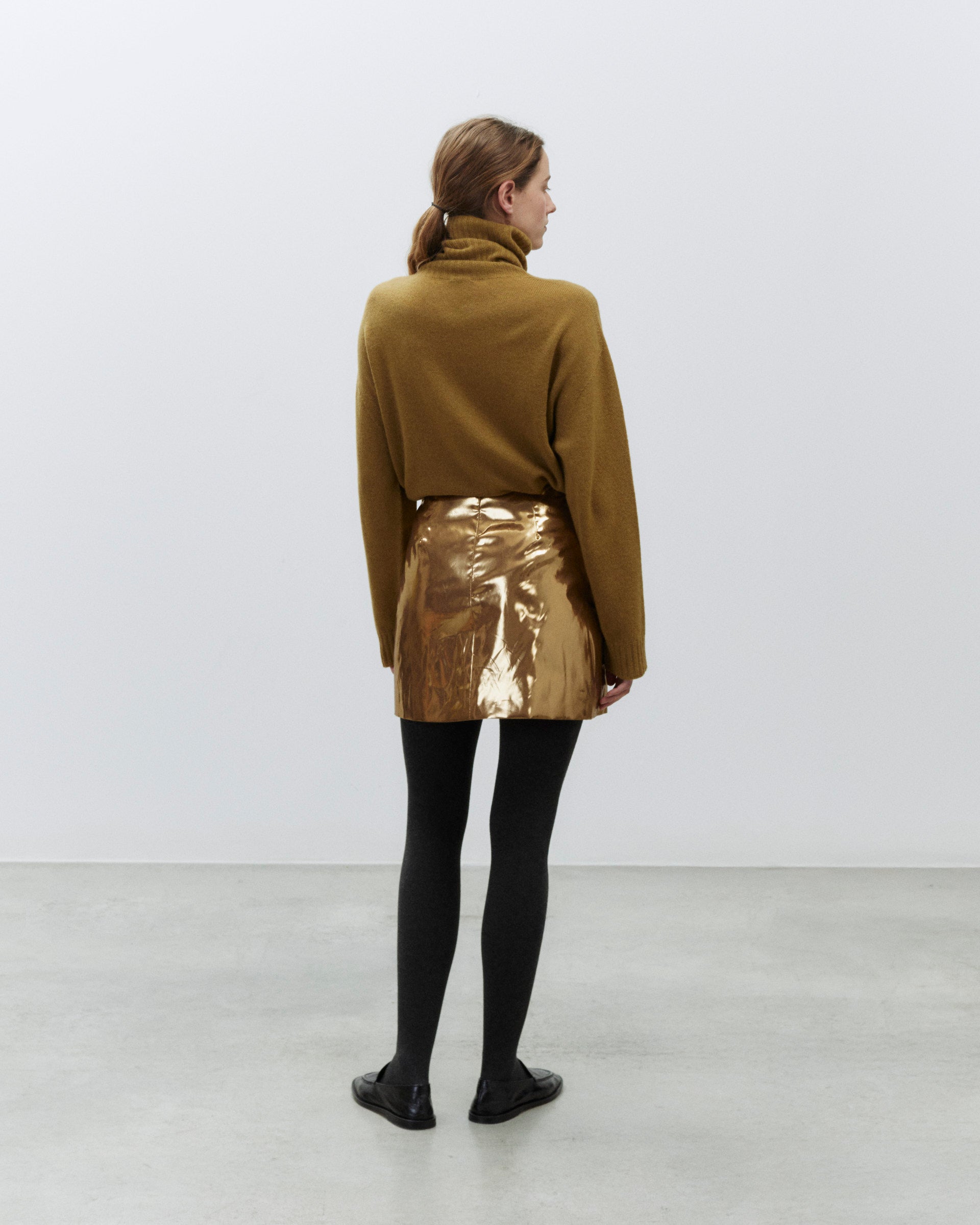 The Alysi Golden Skirt 165034 is a striking miniskirt crafted with a lustrous gold finish that commands attention. Expertly designed to combine bold style with a flattering silhouette, this piece adds a touch of luxury and modern elegance to any wardrobe, perfect for making a confident statement.