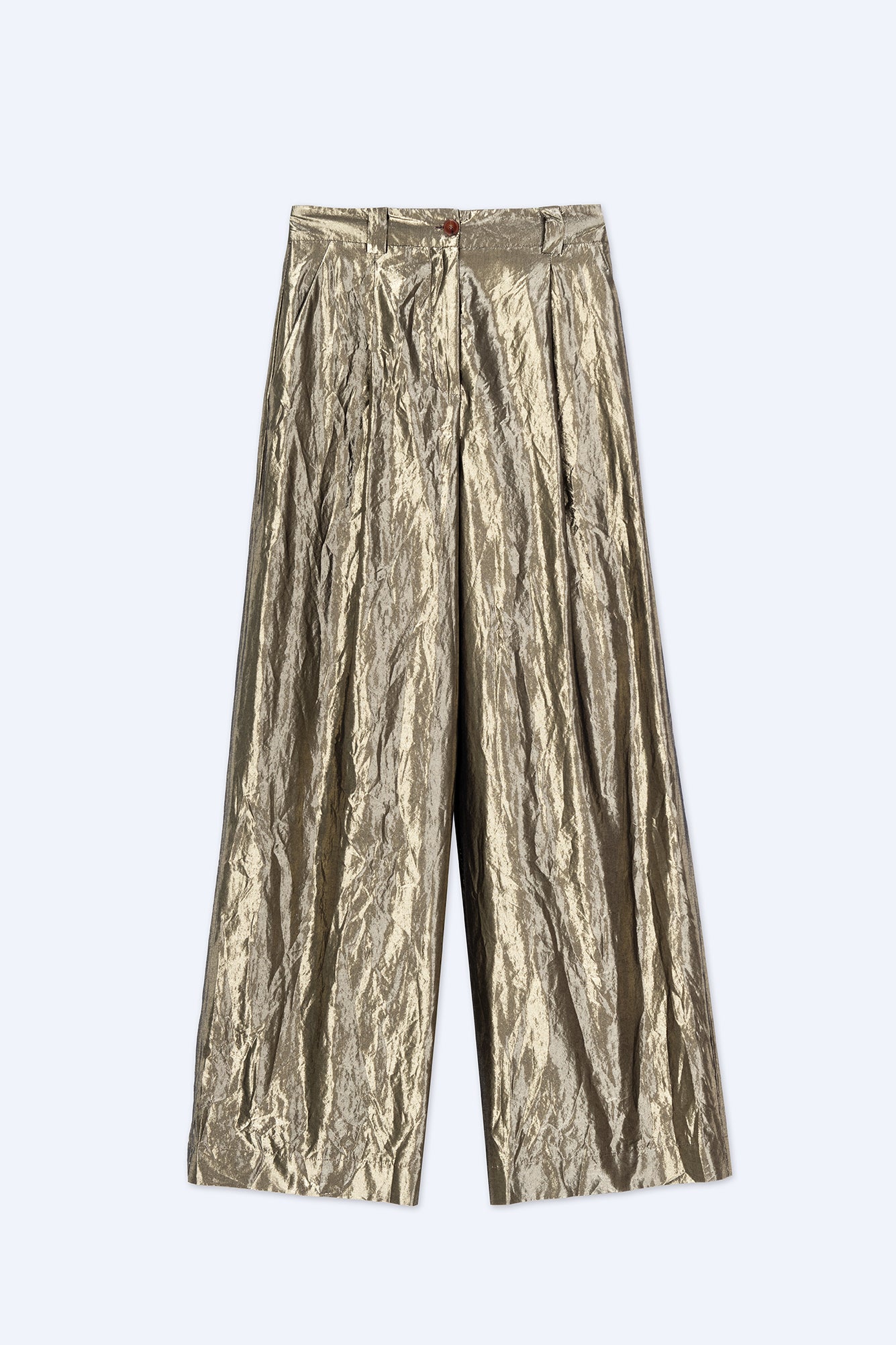 These Alysi Shiny Gold Trousers feature a tailored fit and a unique shiny, crinkle-effect fabric. The front pleats and side and back pockets add style and functionality, while the contrast resin button adds a touch of refinement. Made of a cotton-polyester blend for comfort and breathability.