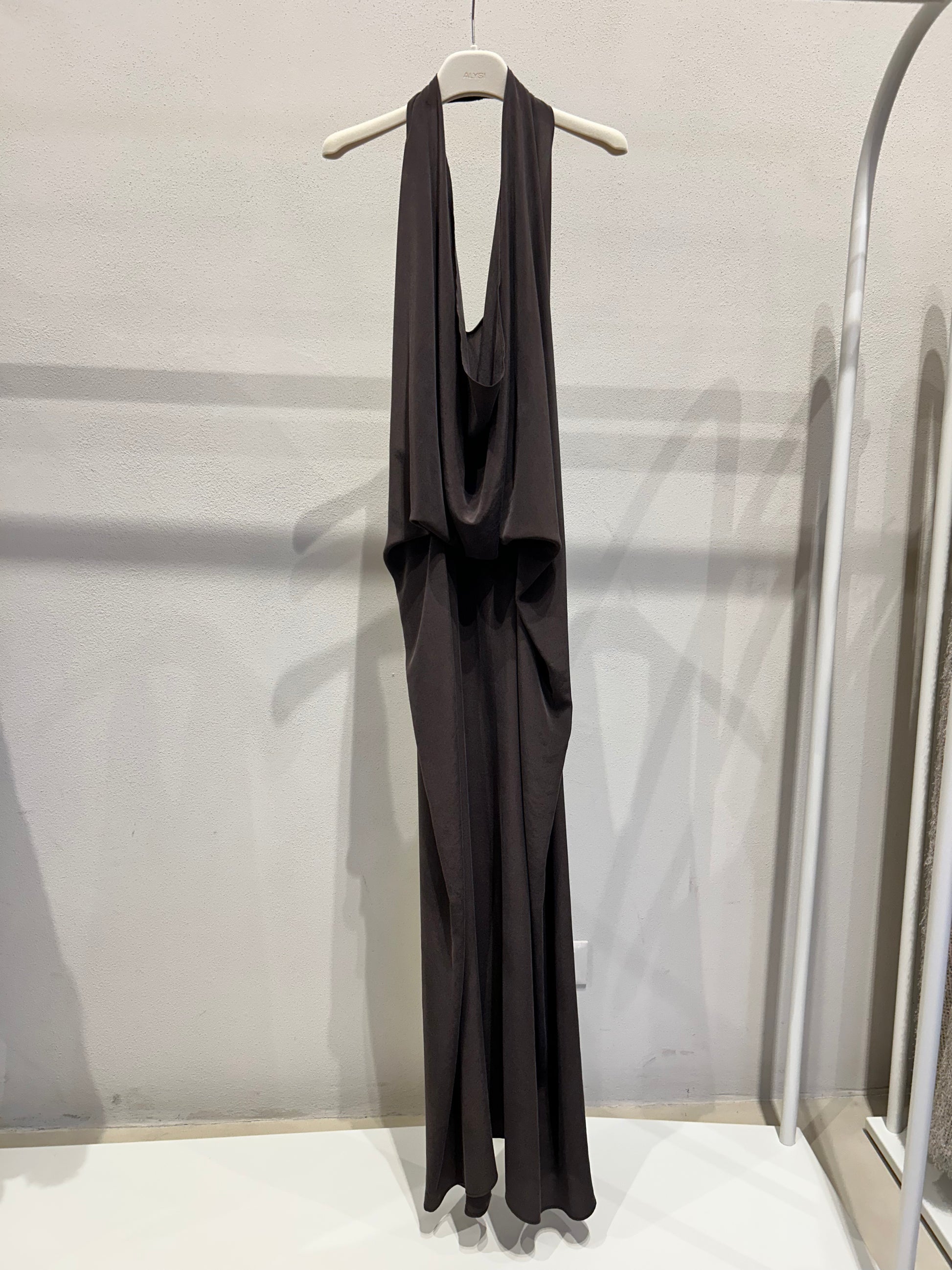 Elegant halter silhouette crafted from luxurious silk, designed for refined occasions. This piece showcases the timeless appeal of hand-finished silk construction, offering a sophisticated drape that flatters the neckline. Perfect for those seeking understated luxury with architectural detail.