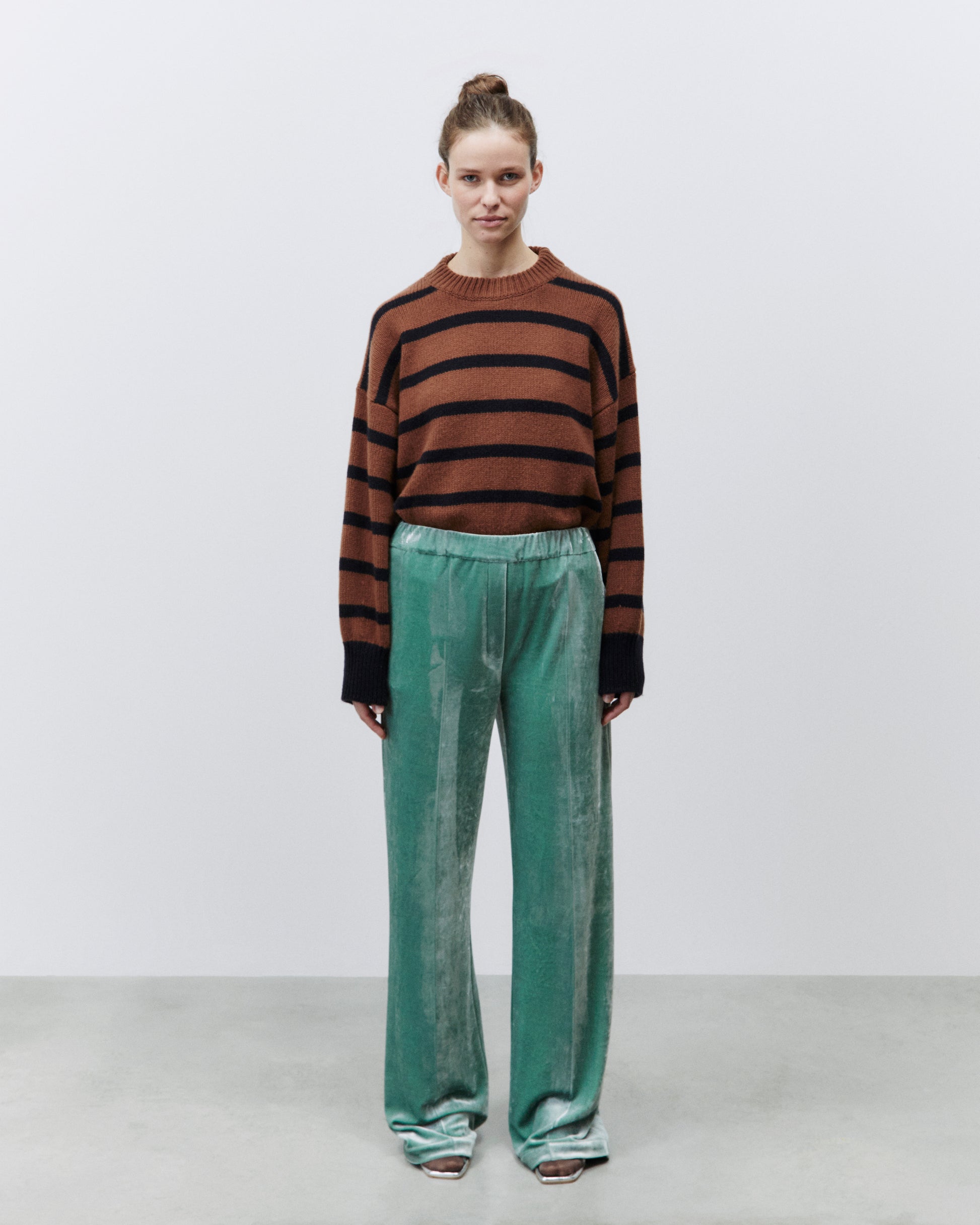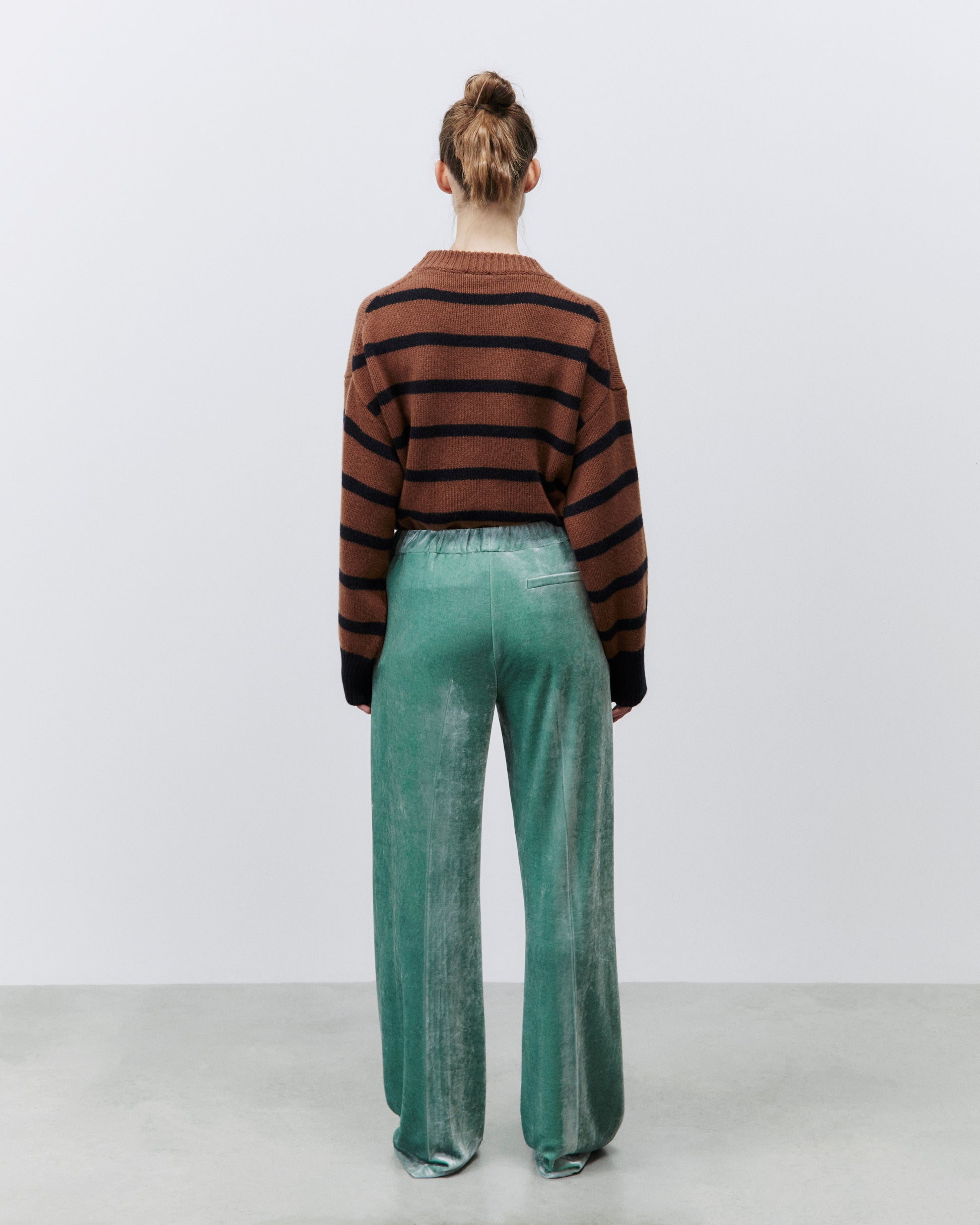 Expertly crafted from a luxurious blend of 56% viscose and 44% polyester, these Alysi Velvet Trousers offer a soft and velvety feel. The wide-leg design provides both comfort and style, making them a versatile addition to any wardrobe. Elevate your look with these elegant and sophisticated trousers.