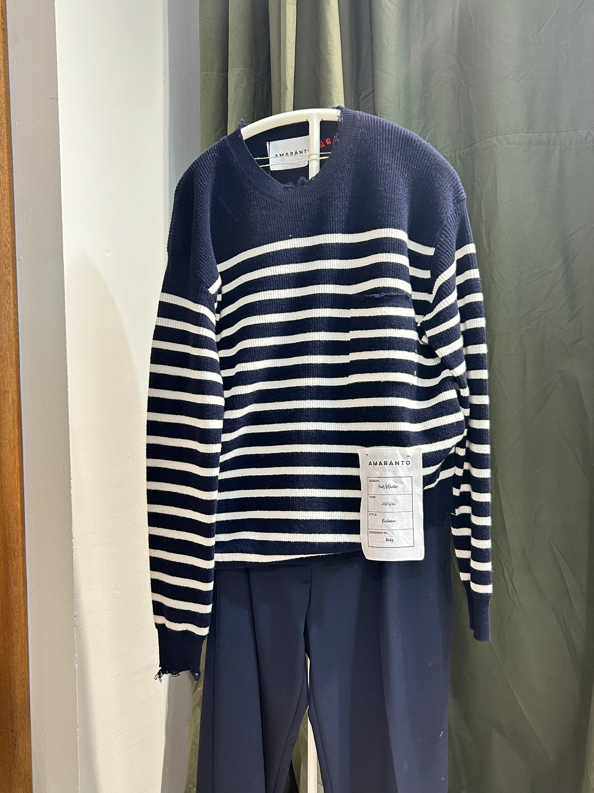 This AMARÁNTO B9F0052 crewneck sweater combines timeless style with expert craftsmanship. Made from 100% wool, it offers warmth and natural breathability. The ribbed knit and subtle striping add texture and sophistication, while distressed detailing lends a modern, edgy touch. Featuring a classic round neckline and long sleeves, this sweater provides a comfortable and refined fit suitable for both casual and elevated looks.