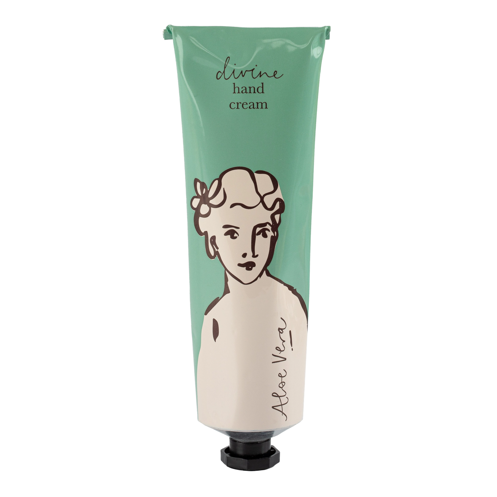 The aloe vera-scented hand cream in a green tube featuring the divine lady by Wanderlust, packaged in a matching green box with gold foil writing.