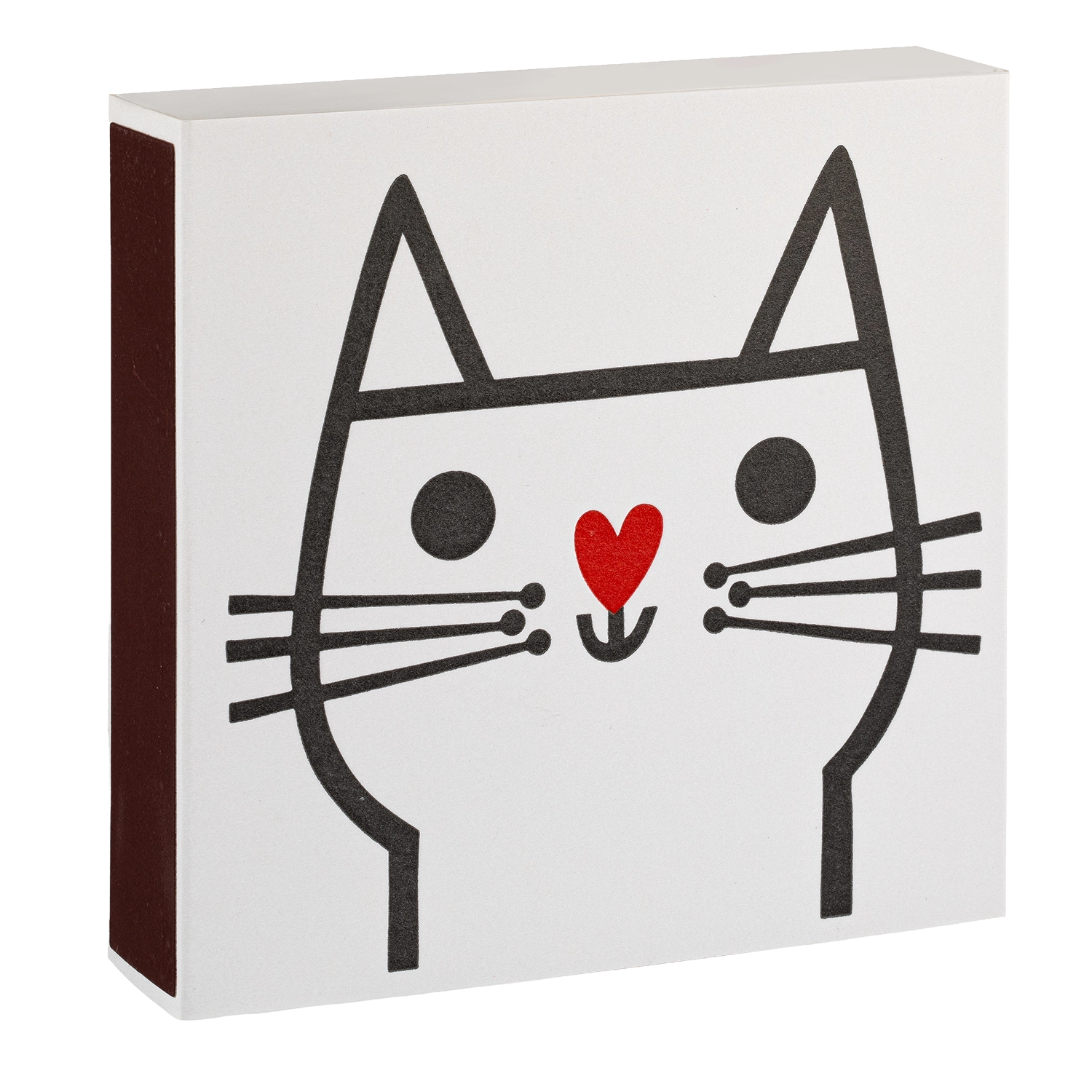 The signature square matchbox from Archivist Gallery featuring a black line drawing of a cute cat with a red heart for its nose.