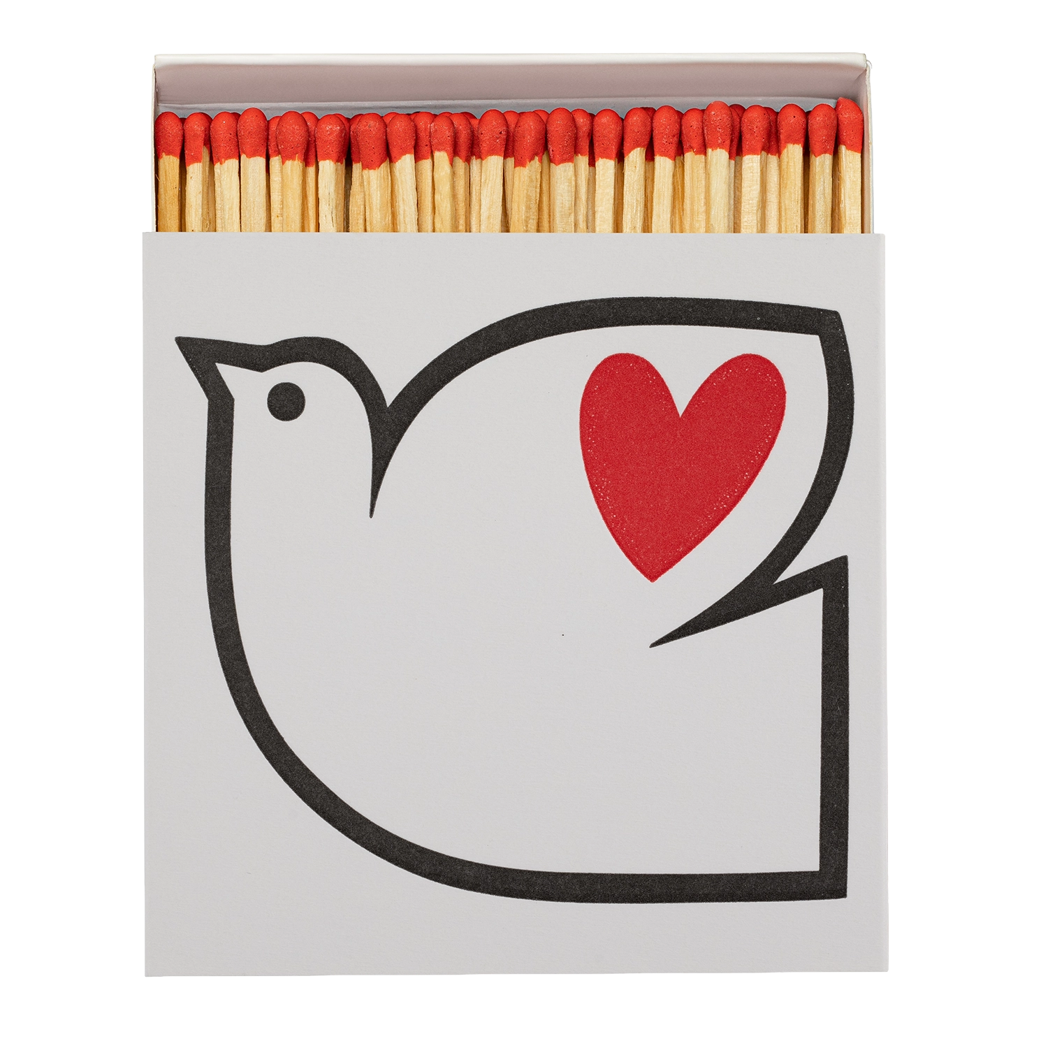 The signature square matchbox from Archivist Gallery featuring a black line drawing of a dove with a red heart printed on its wing.