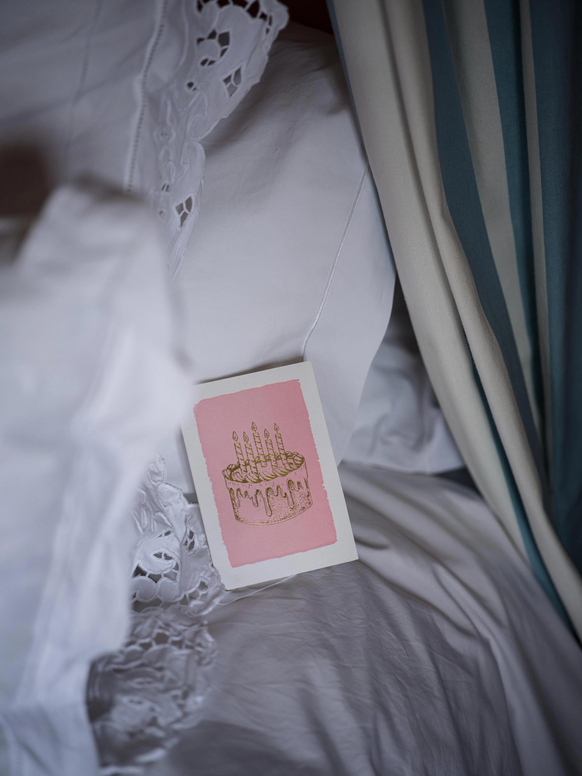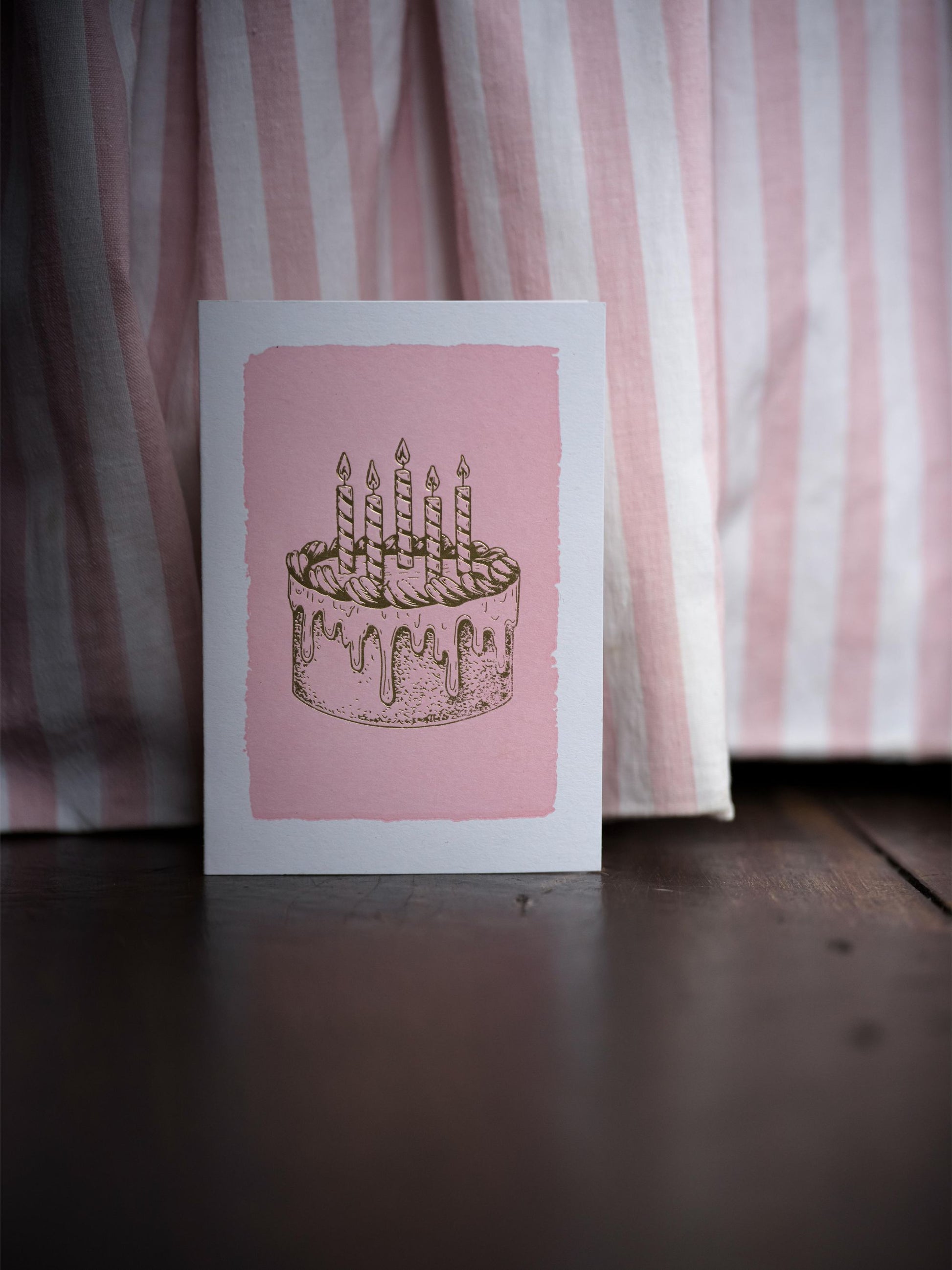 Small letterpress card with a baby pink background featuring a gold foil cake.
