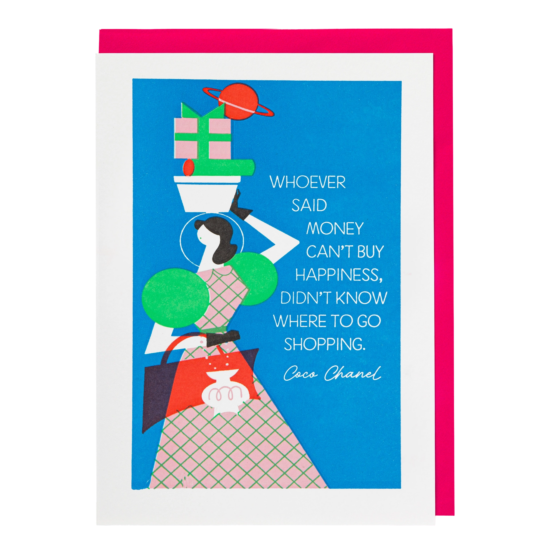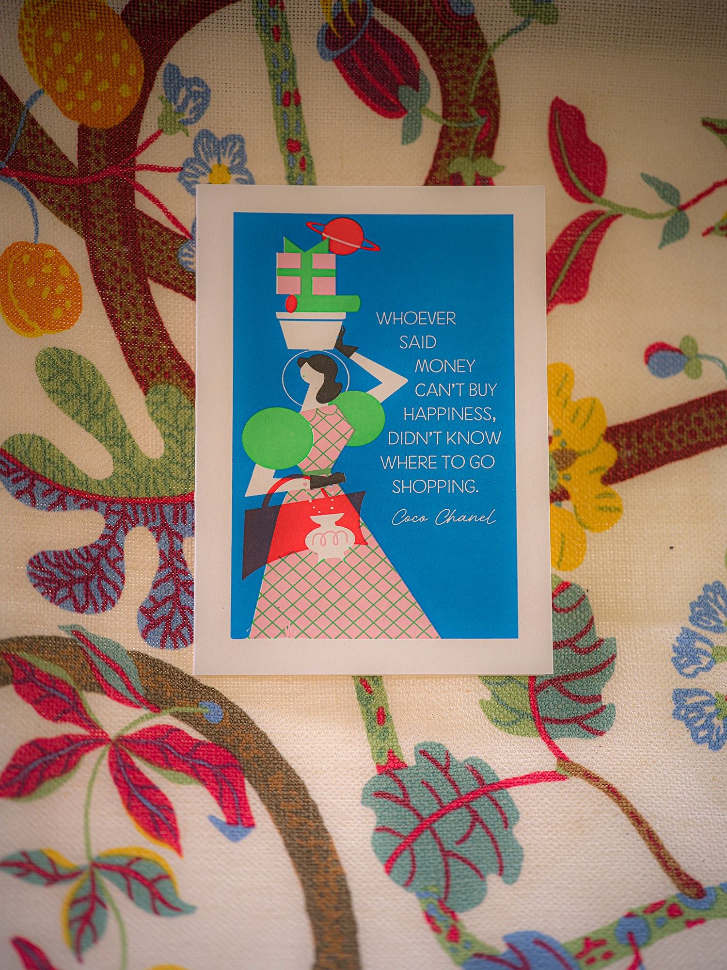 The letterpress card with a blue background featuring the illustration of a woman carrying shopping bags and the words 'whoever said money can't buy happiness, doesn't know where to go shopping.'