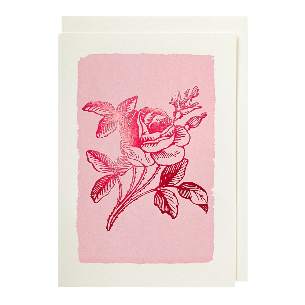 Small letterpress card with a baby pink background featuring a pink foil rose.