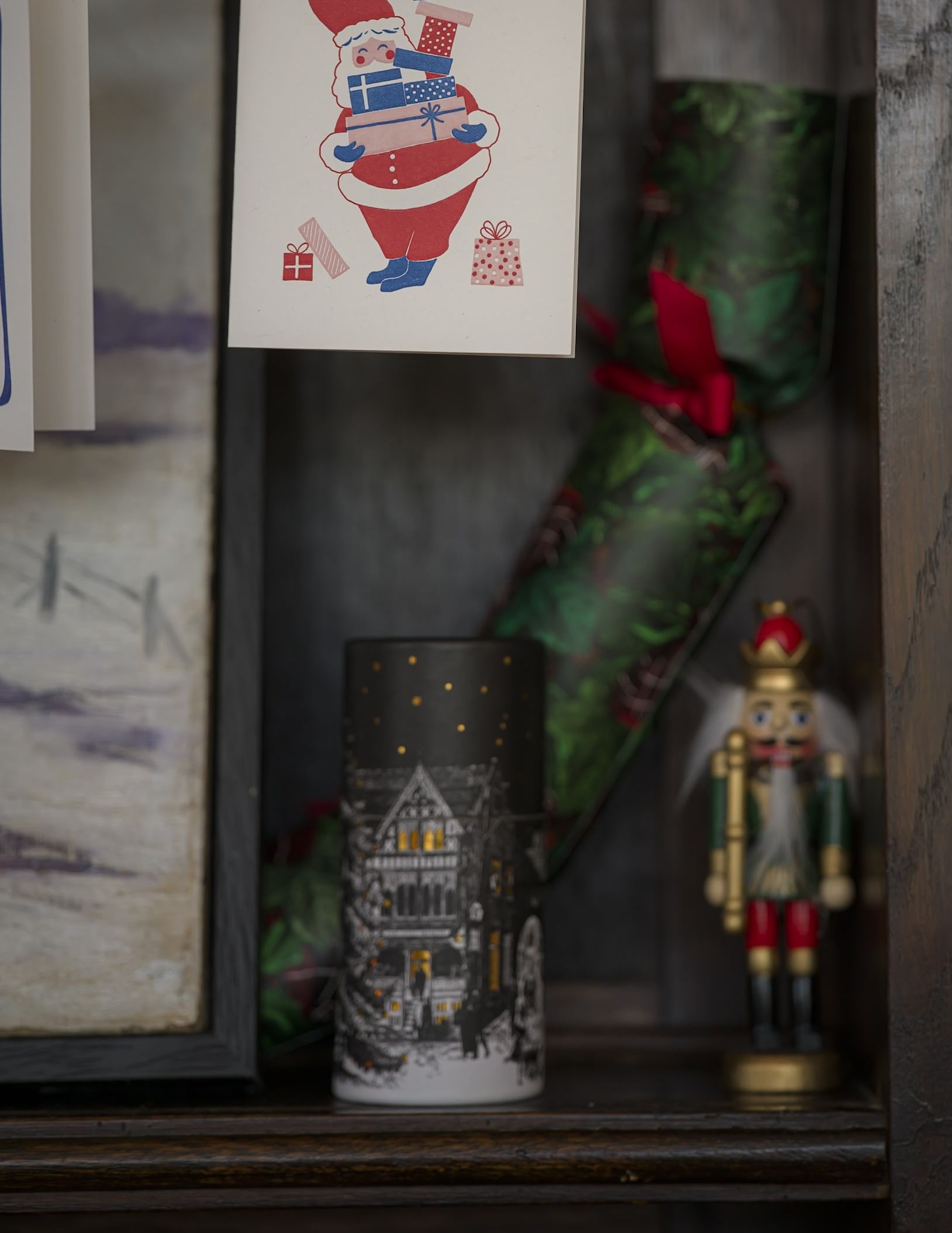 The large cylinder matches featuring a snowy scene of red brick homes, a Scotty dog, and a red letterbox.