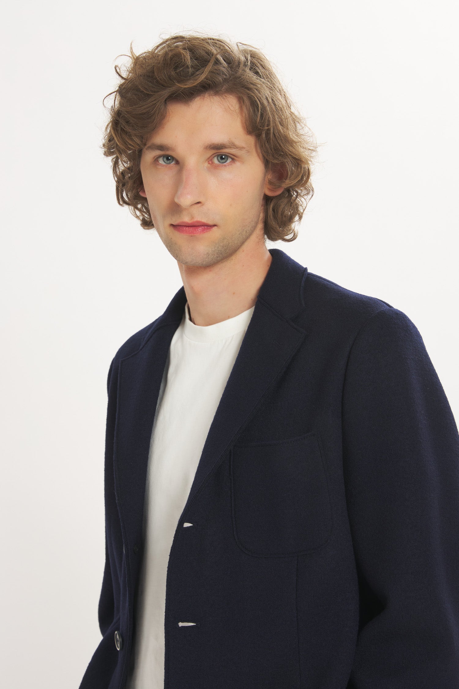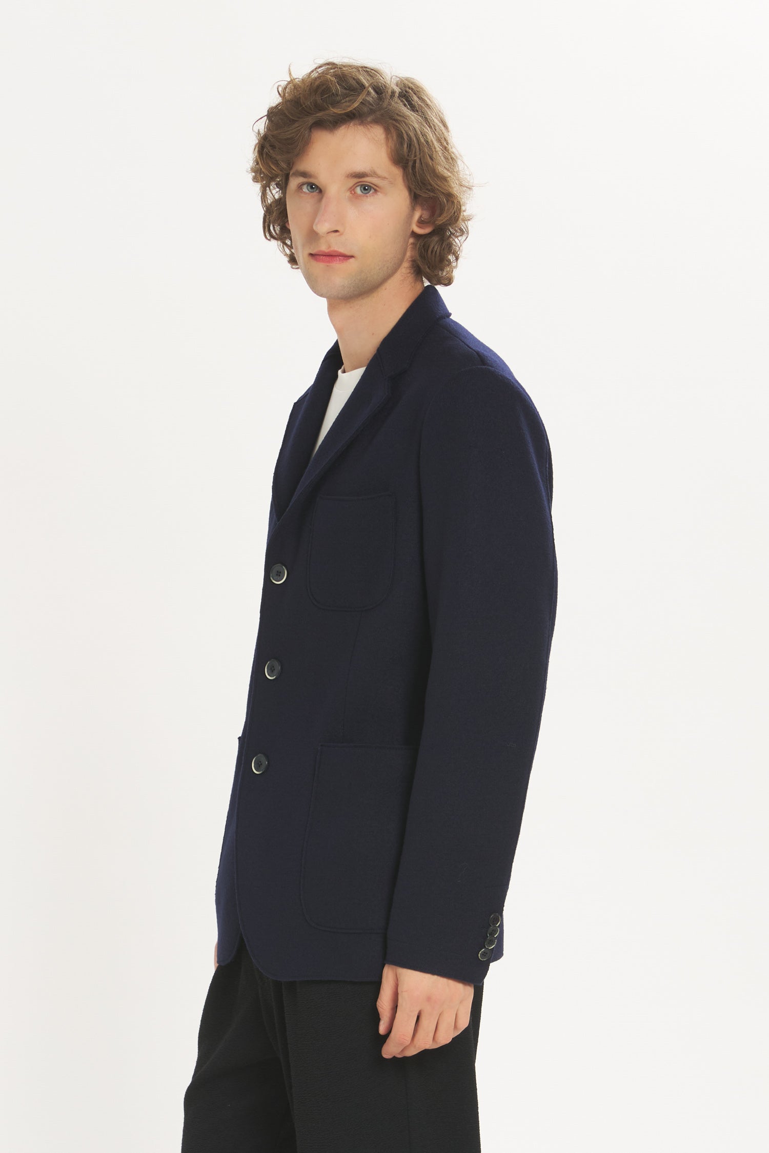 Unstructured, three-button blazer, single vent, two front patch pockets and single chest pocket, internal slip pocket.