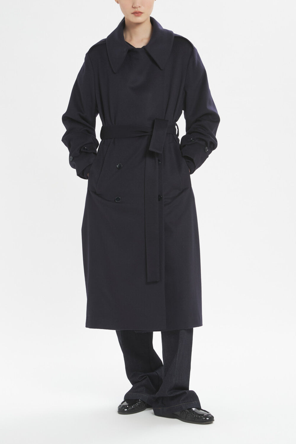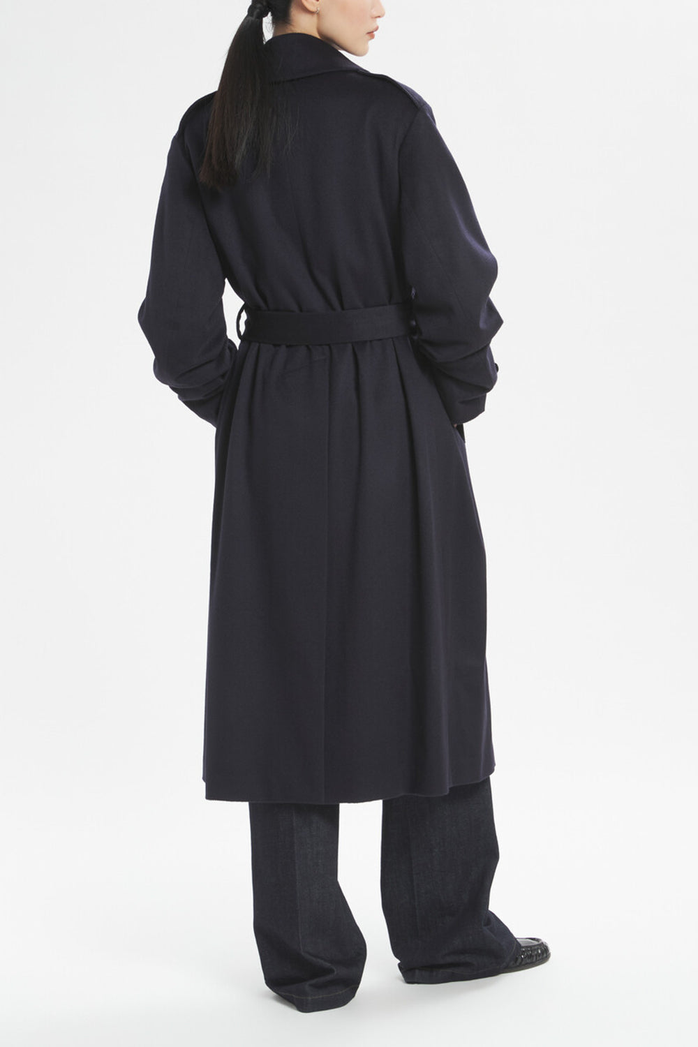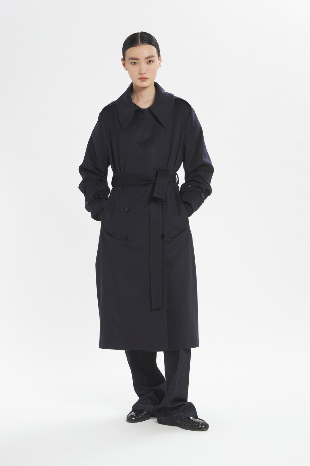 Double-breasted trench coat with tailored lapels, removable belt at waist, dropped armholes, adjustable two-button cuffs. Fully lined, with epaulets on the shoulders.