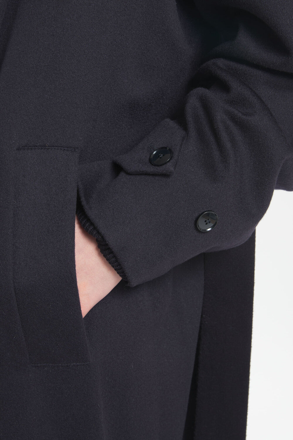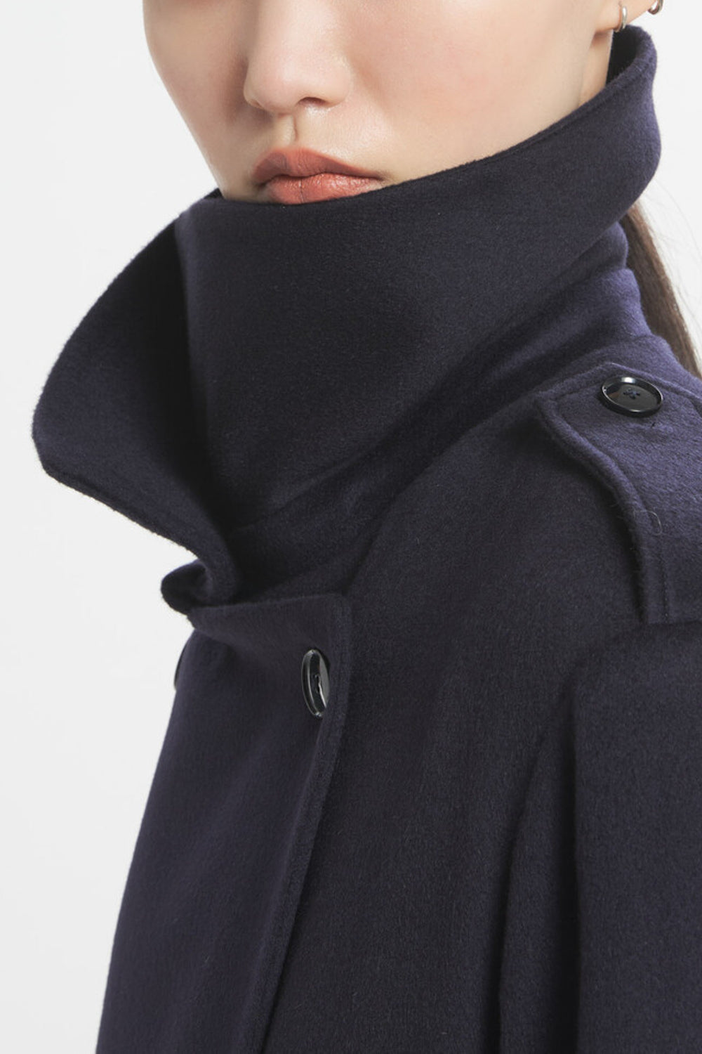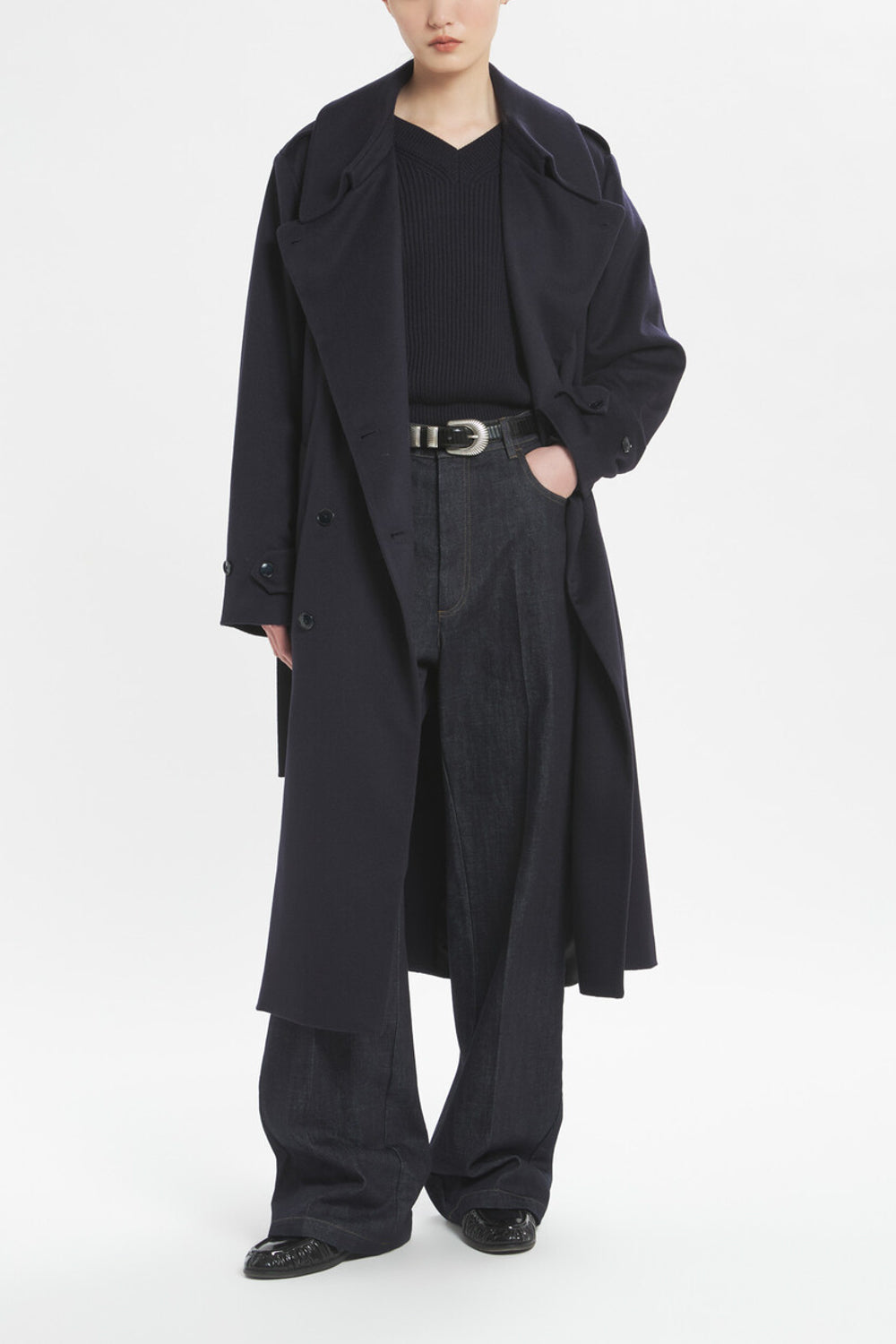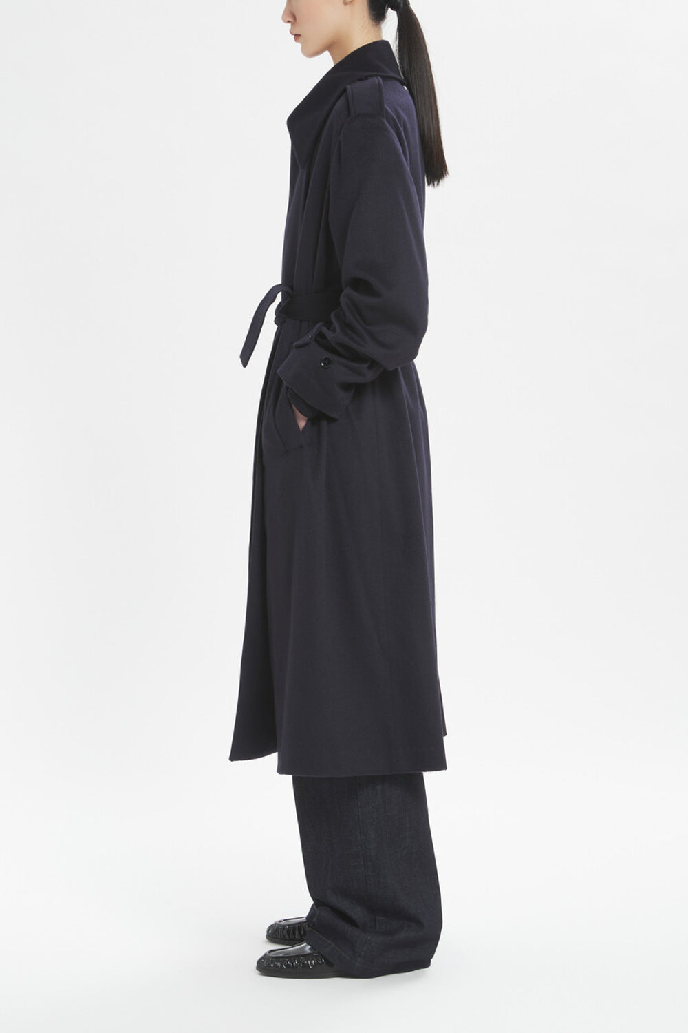 Double-breasted trench coat with tailored lapels, removable belt at waist, dropped armholes, adjustable two-button cuffs. Fully lined, with epaulets on the shoulders.