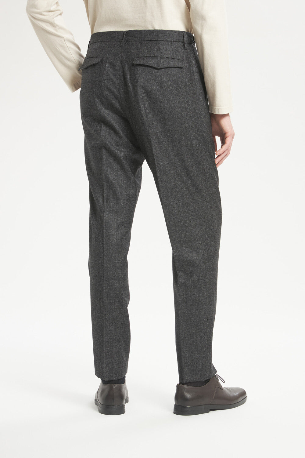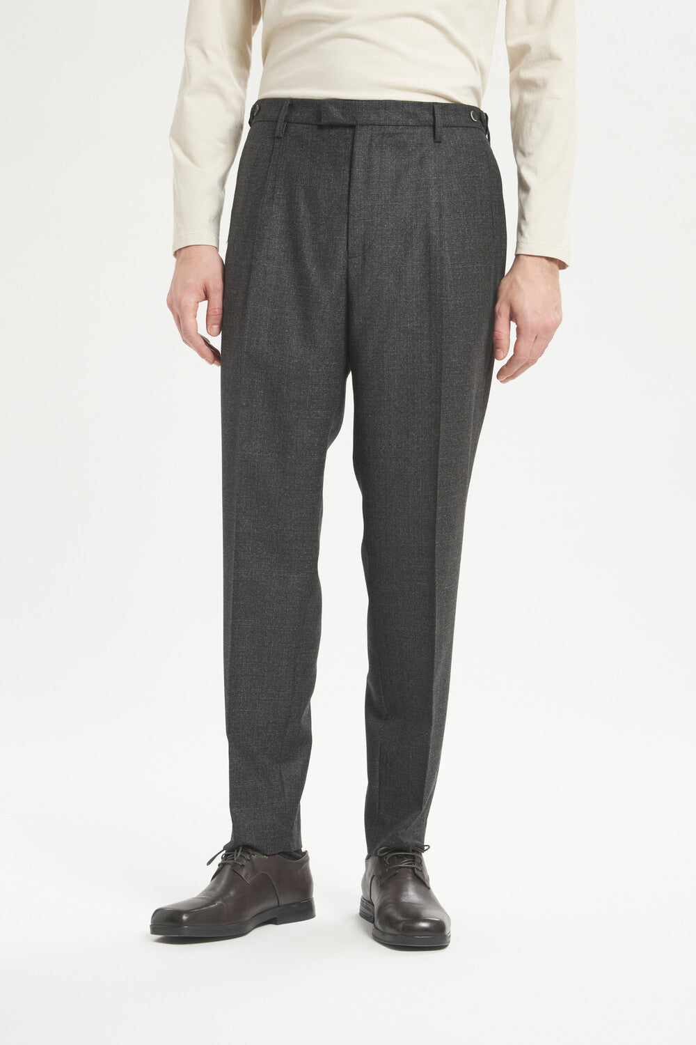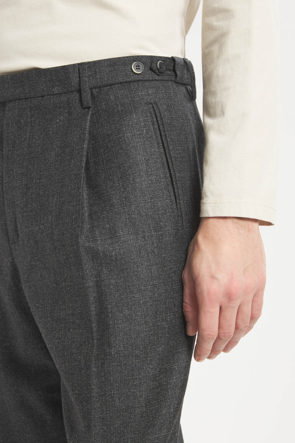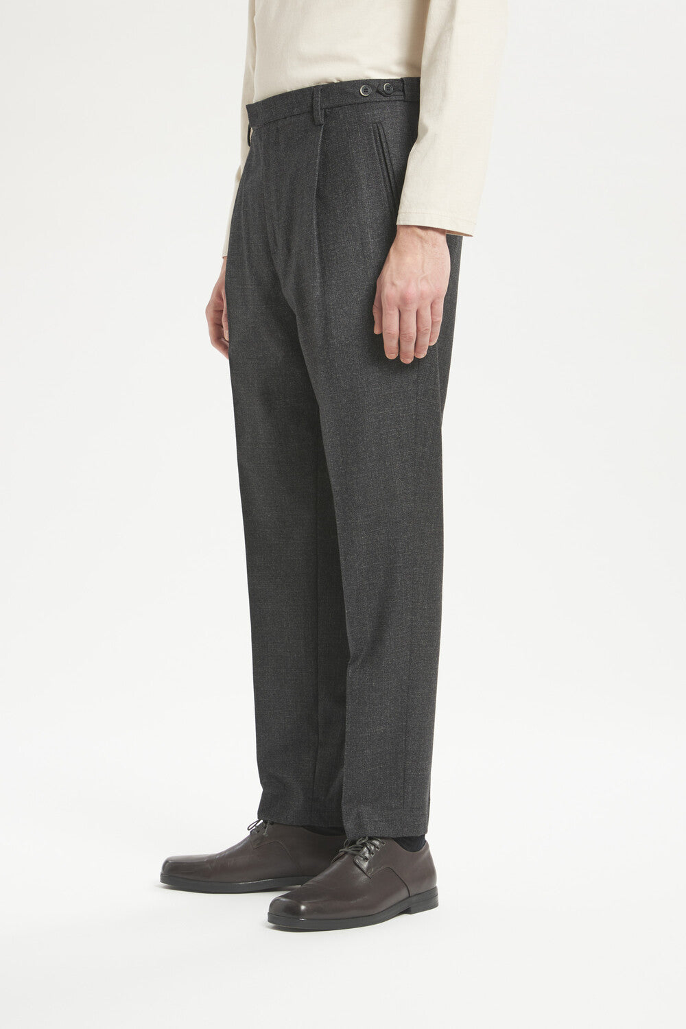 Mid-rise pants with four pockets, belt loops and adjustable buttoned tabs at the waistband. Pleats at the front and central creases at front and back.