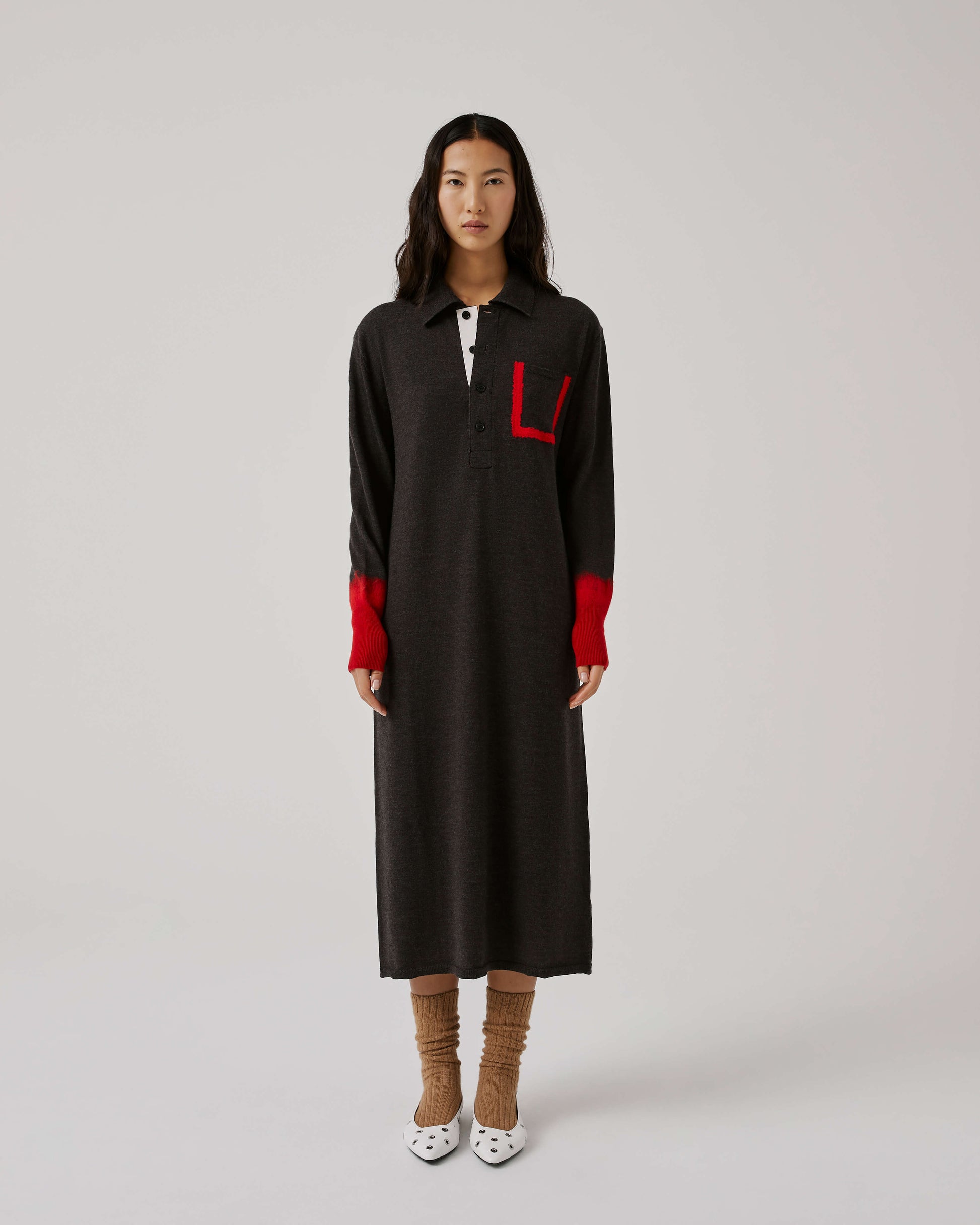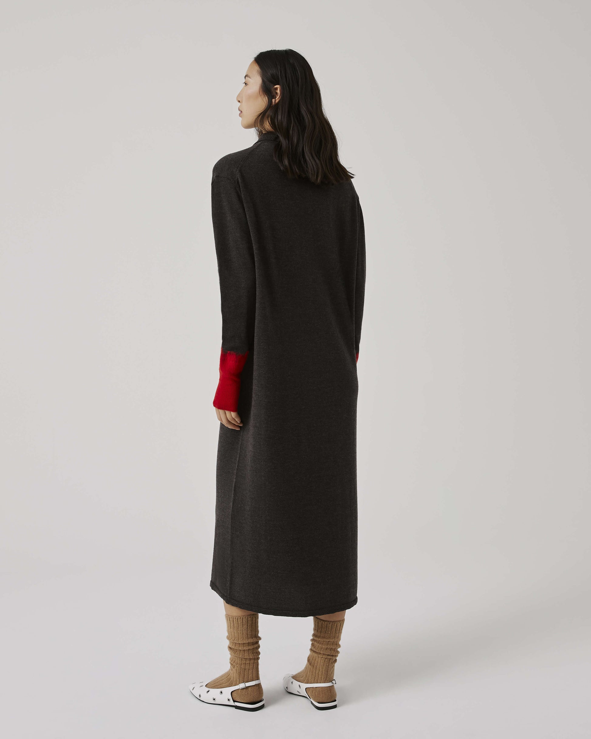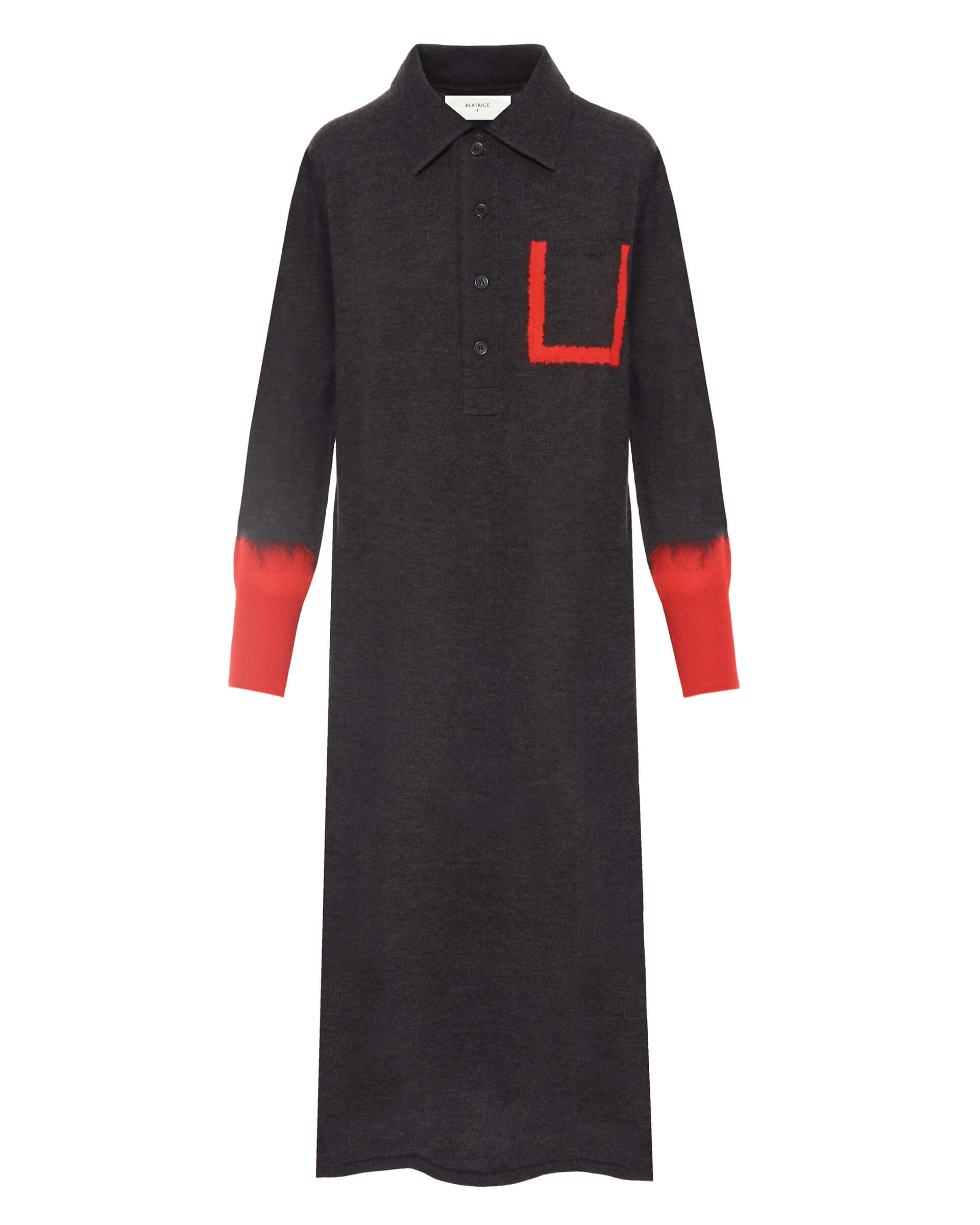 One of the most exclusive production processes of the collection -handmade needling- enriches this knitted dress on the pocket and cuffs, creating a refined and conceptual degradé effect. It features a polo opening with a neckline finished with grosgrain fabric and visible buttons, long sleeves with ribbed cuffs and a soft silhouette. Midi length.