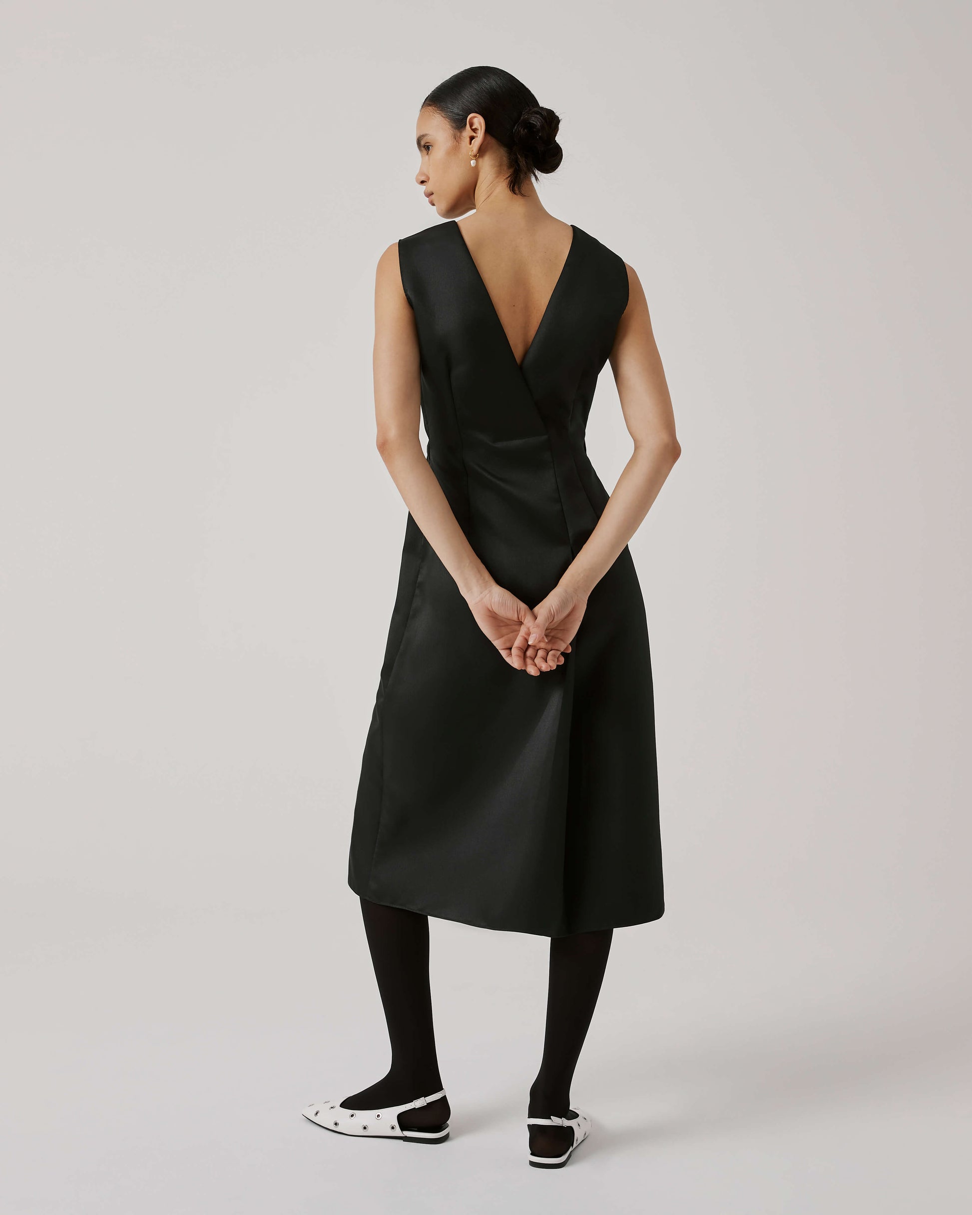 Made of duchess, this sheath dress features a crew neck, gathered waist with internal elastic, V-neckline with pleat on the back and invisible zip opening on the side. Made in Italy.