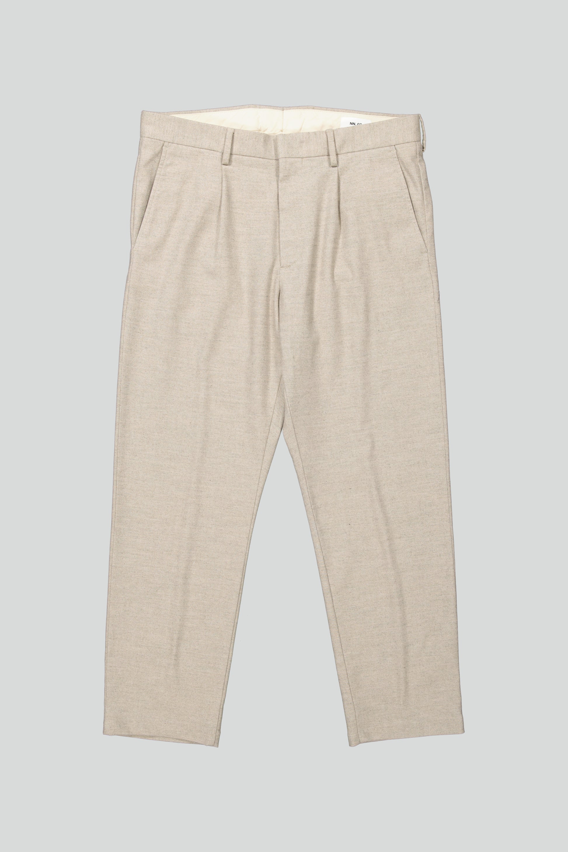 Trousers crafted in a cotton blend with a touch of stretch. Features a minimalist design with a crisp crease along the leg, blind hem, and hidden button closure.