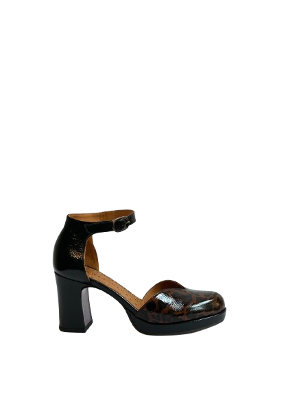 The Chie Mihara DAMAHO45 combines style and comfort with its leopard print and soft leather lining. The patent effect adds a touch of sophistication to the classic brown and black colors. With a real heel height of 5.9cm and a platform of 1.6cm, these shoes provide a comfortable and stylish boost. The buckle-closure ensures a secure fit, while the rubber and half leather sole offer durability.