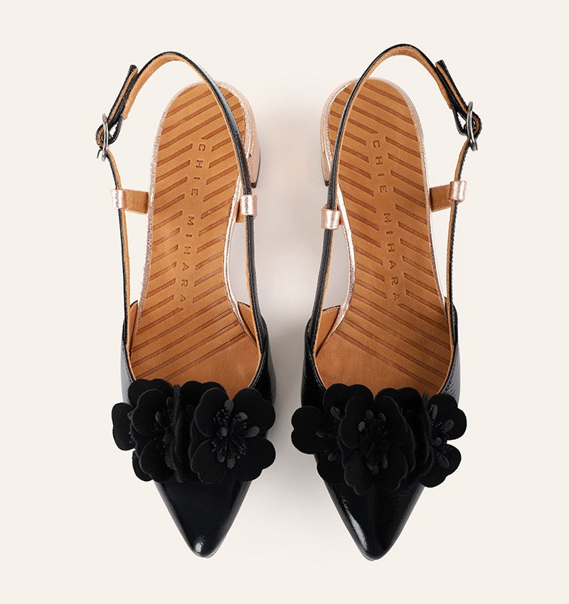 Chie Mihara Hezel combines refined craftsmanship with understated elegance. This buckle-closure shoe features patent and metallic leather accents alongside supple suede in black and peach. The stacked heel measures 2.5 cm on size 37, scaling proportionally across sizes. Soft leather lining ensures comfort throughout the day.