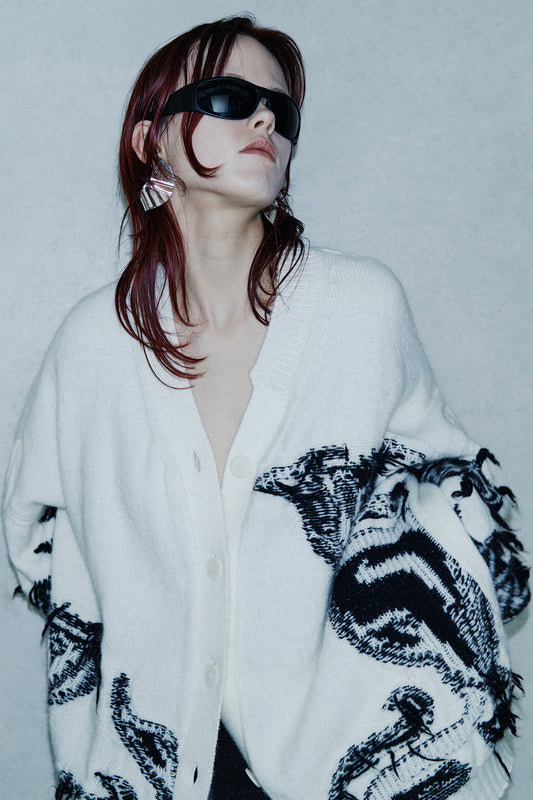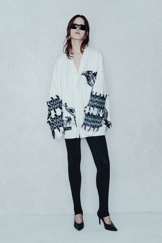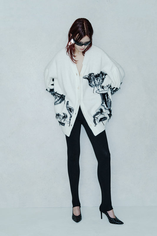 This cardigan features a reverse Liberty jacquard pattern with dropped shoulders and balloon sleeves, designed in an oversized fit that extends below the hip. Crafted from a blend of 28% mohair, 46% acrylic, 19% polyamide, and 7% polyester, it offers both texture and comfort.