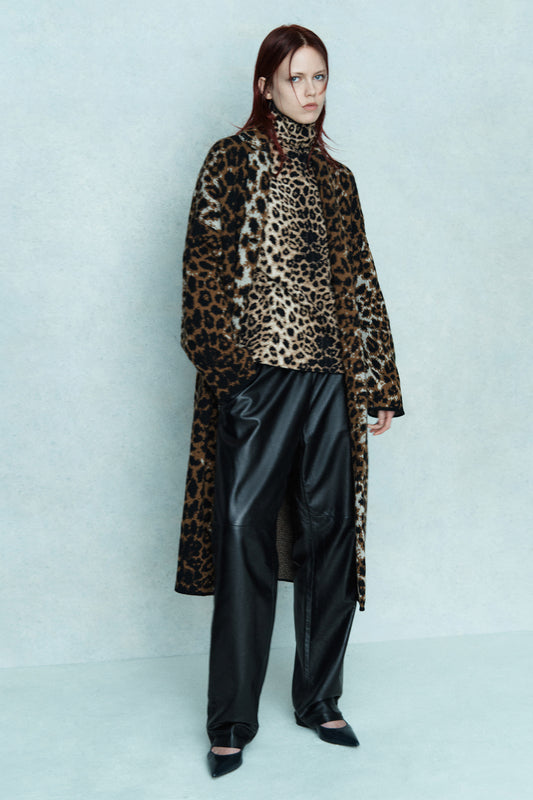 This unlined coat features a wool blend animalier jacquard fabric with side welt pockets. Designed in an oversized fit with dropped shoulders, it falls below the knee. Crafted from 80% wool and 20% polyamide for durability and comfort.