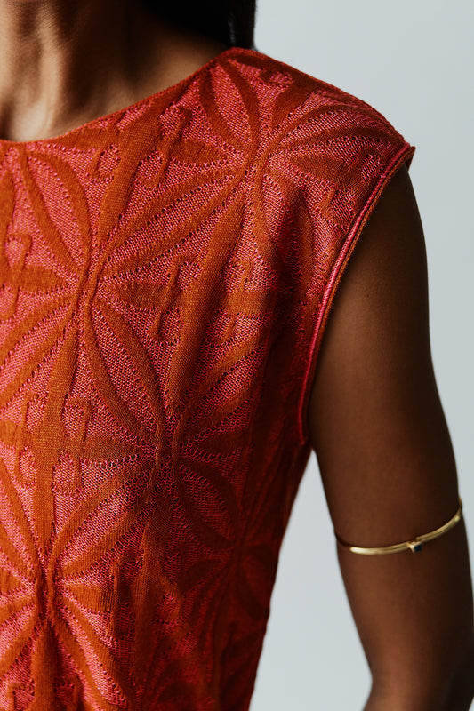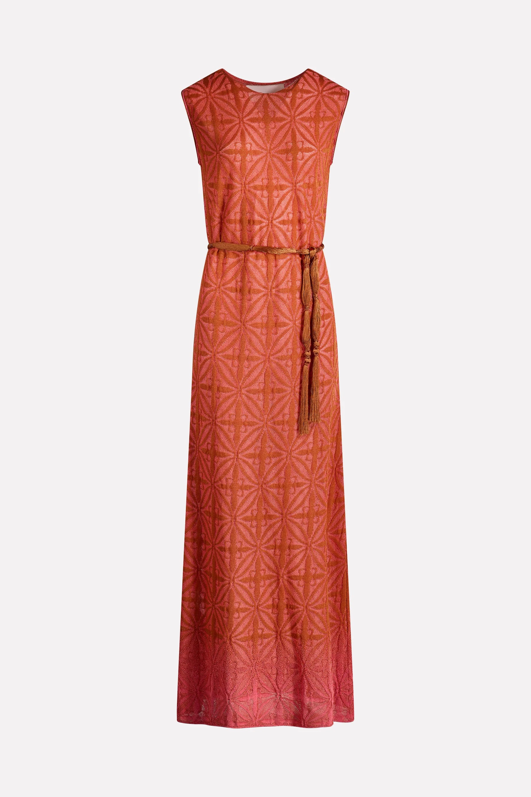 LONG SLEEVELESS DRESS WITH TONE-ON-TONE JACQUARD MAJOLICA PATTERN WITH 3D TEXTURE AND ROPE BELT AT THE WAIST.