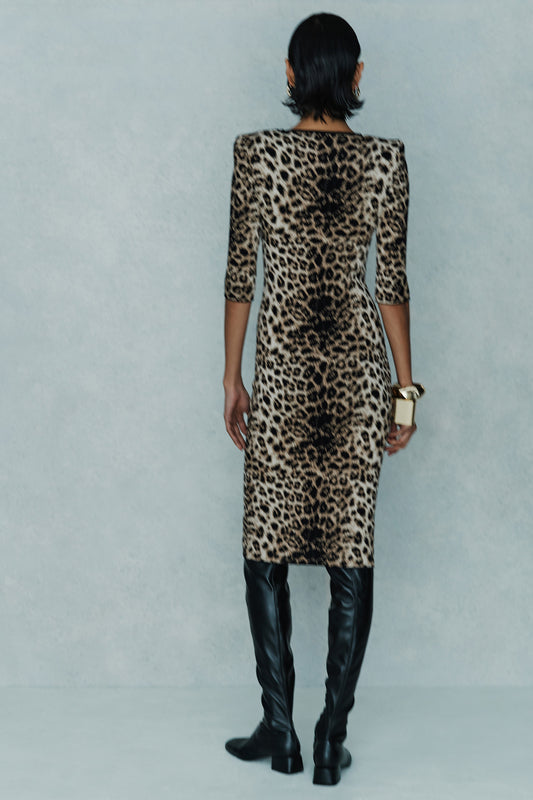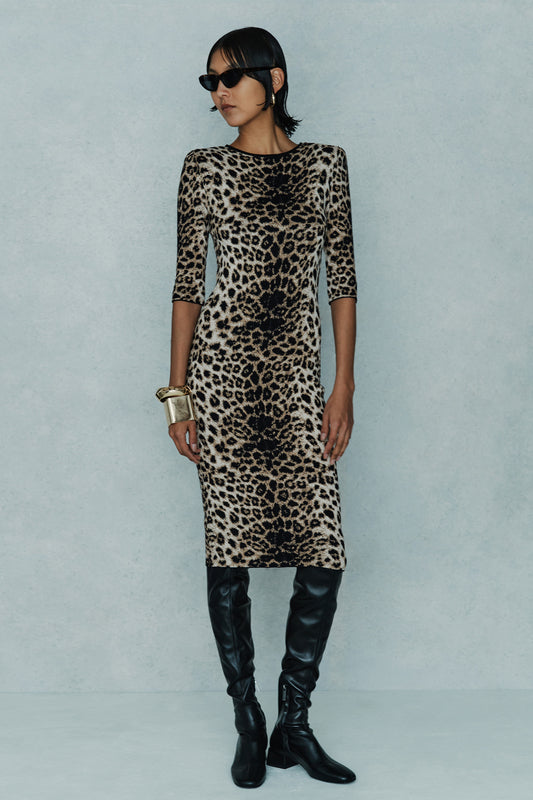 The Circus Hotel Dress H5WK10 showcases a midi-length animalier jacquard design with mid-length sleeves and wide straps, tailored to an ultra slim fit. It combines 72% viscose and 28% polyester in the outer fabric, with a lining composed of 65% viscose and 35% polyamide, ensuring both comfort and structure.