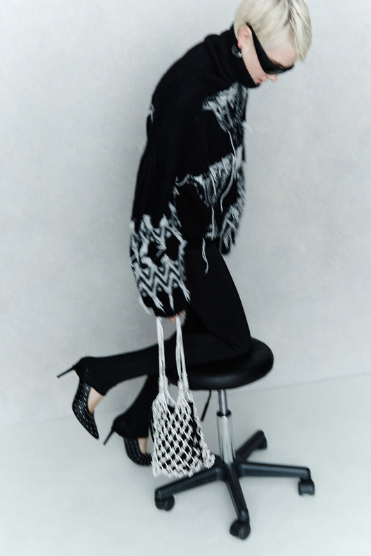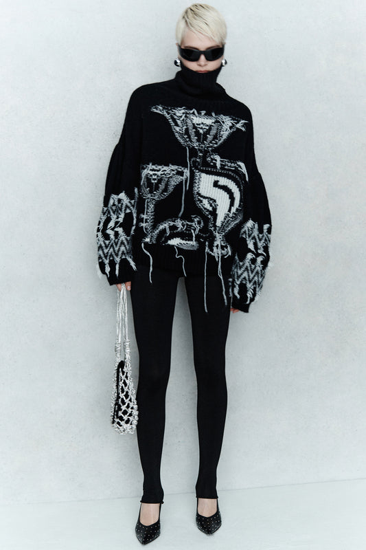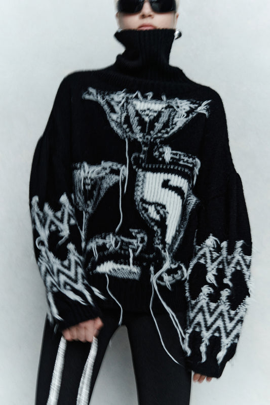 This turtleneck sweater features a reversed Liberty jacquard design, with dropped shoulders and balloon sleeves for a relaxed, oversized silhouette. Its hip-length cut offers a modern fit. Crafted from a blend of 28% mohair, 46% acrylic, 19% polyamide, and 7% polyester, it combines softness with durability.