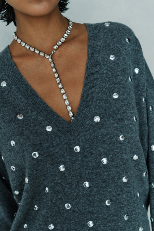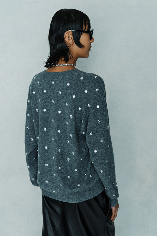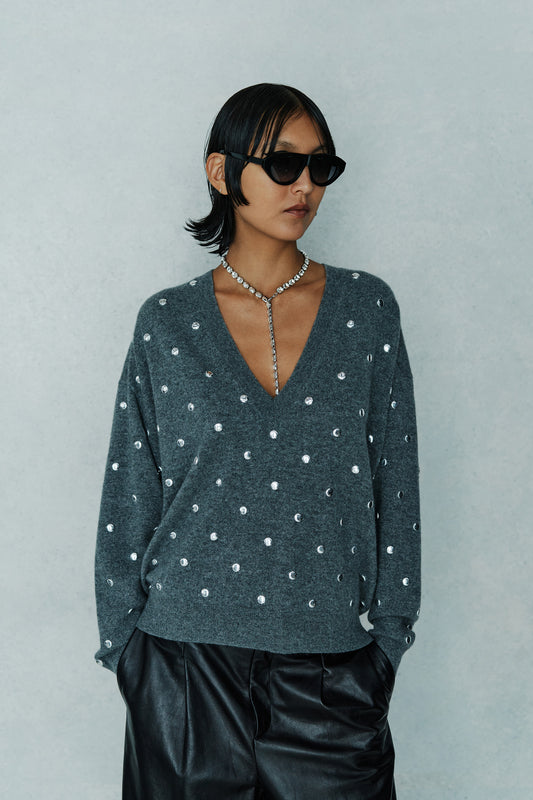 This oversized, hip-length v-neck sweater is made from a 70% wool and 30% cashmere blend, featuring an all-over studded design for a distinctive look.
