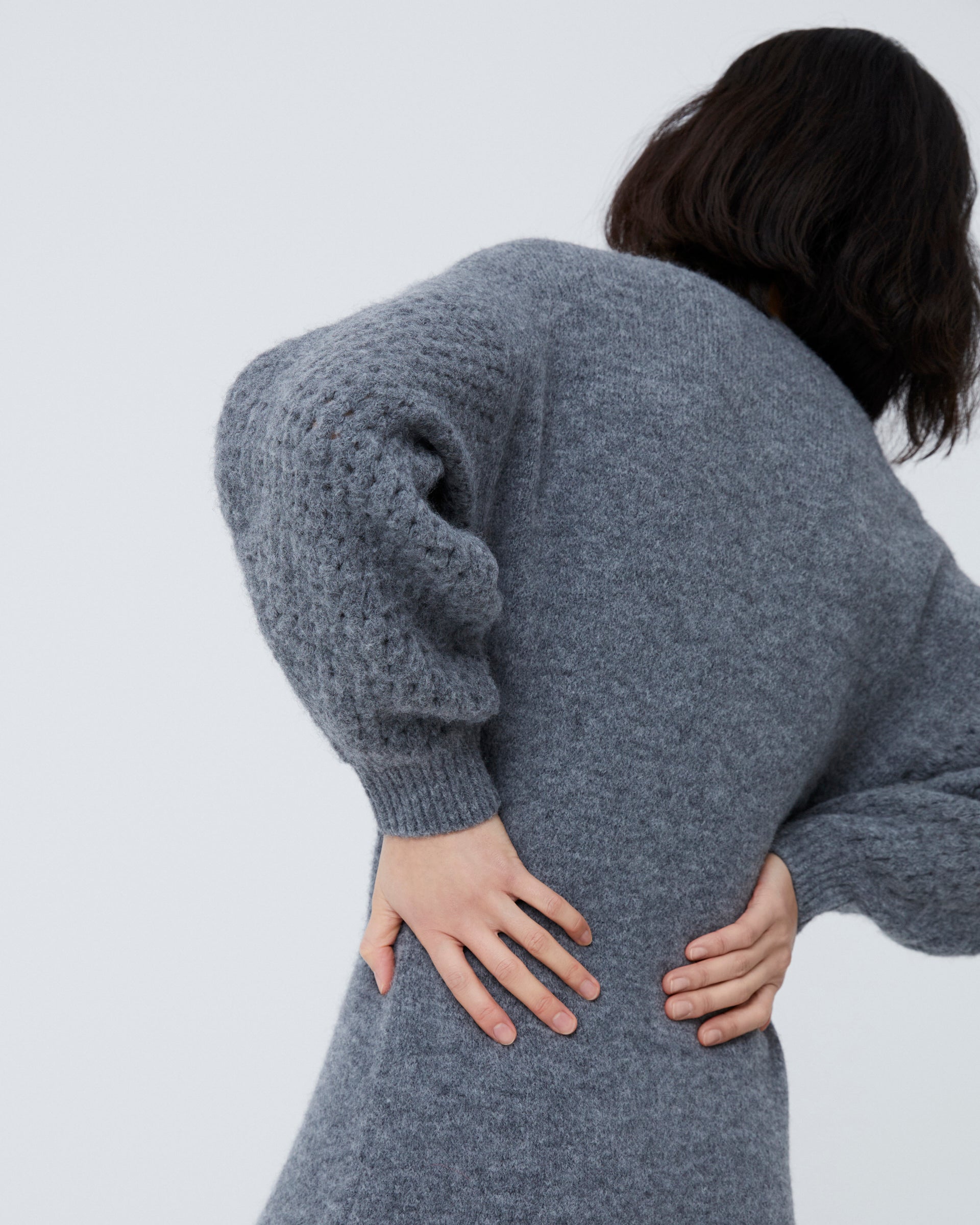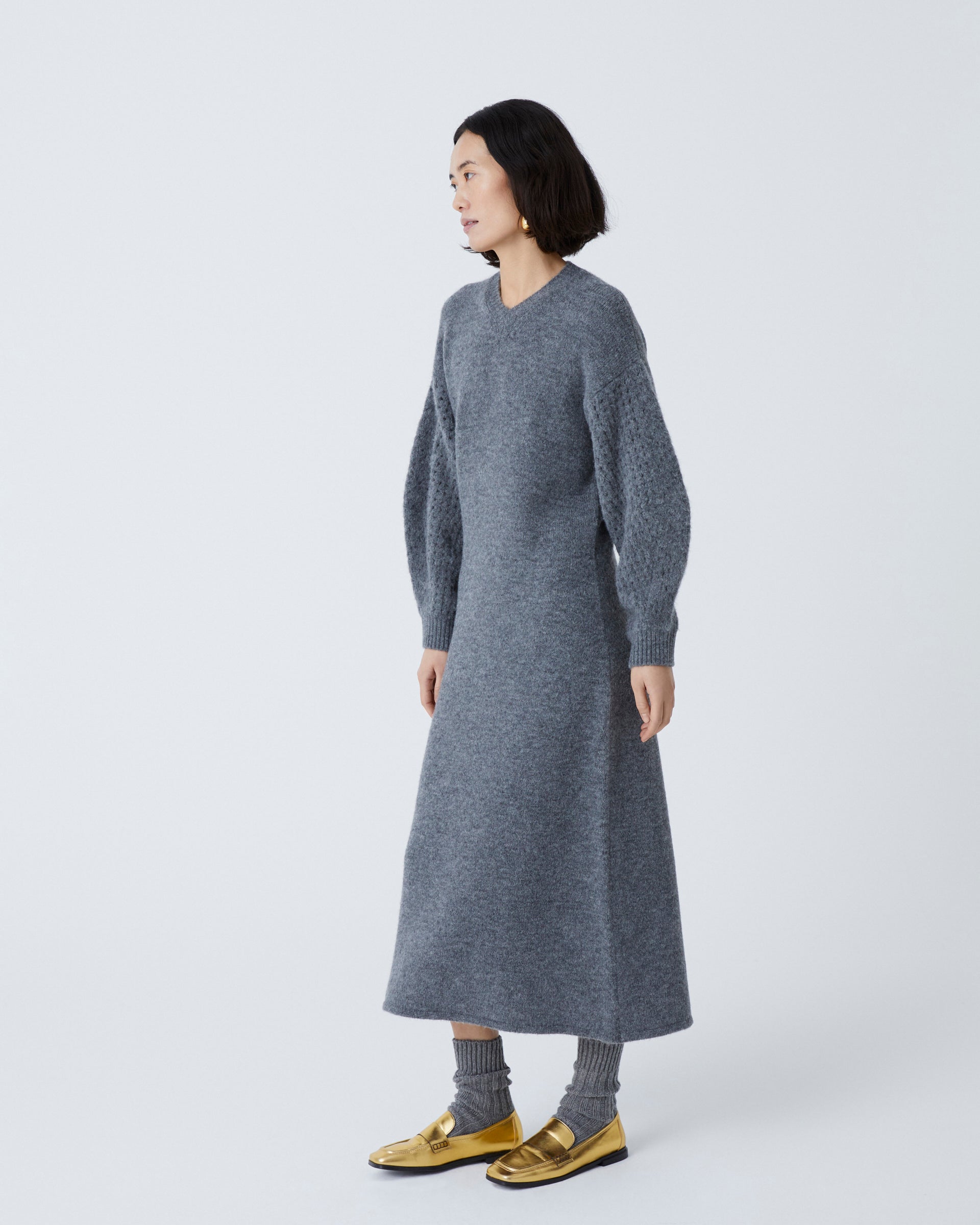 Warm and soft, this garment is the symbol of the winter dress. It is made of stretched mohair and features a fit silhouette, flared at the bottom, micro V-neck, balloon sleeves with embroidery and mini length. Made in Italy.