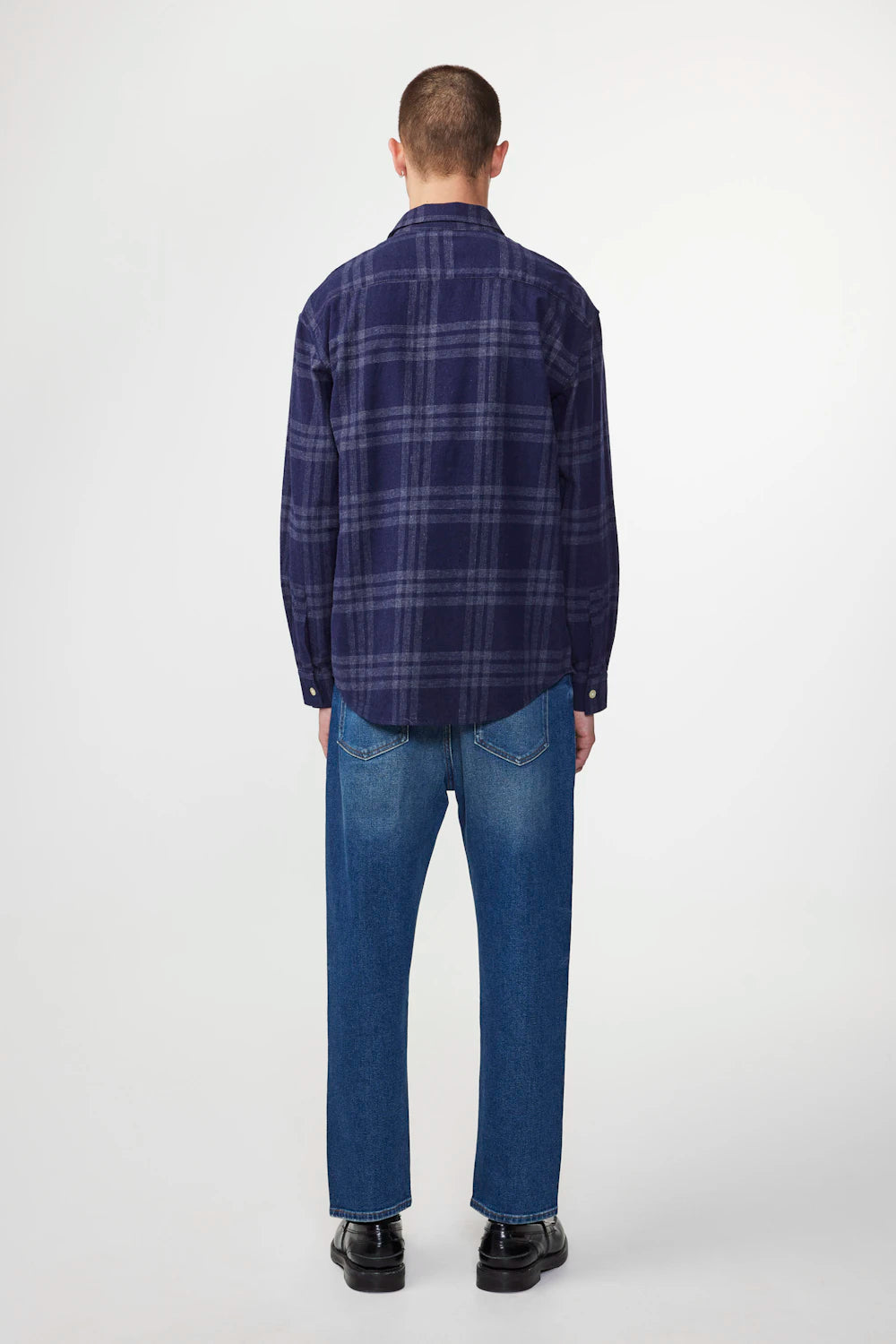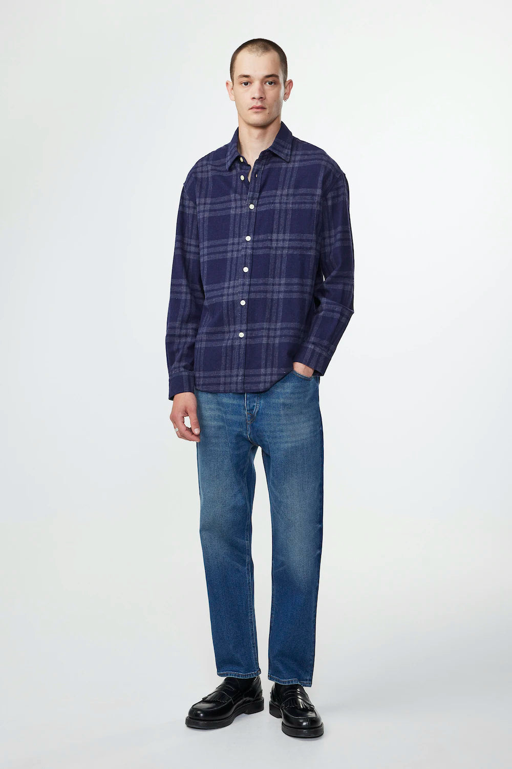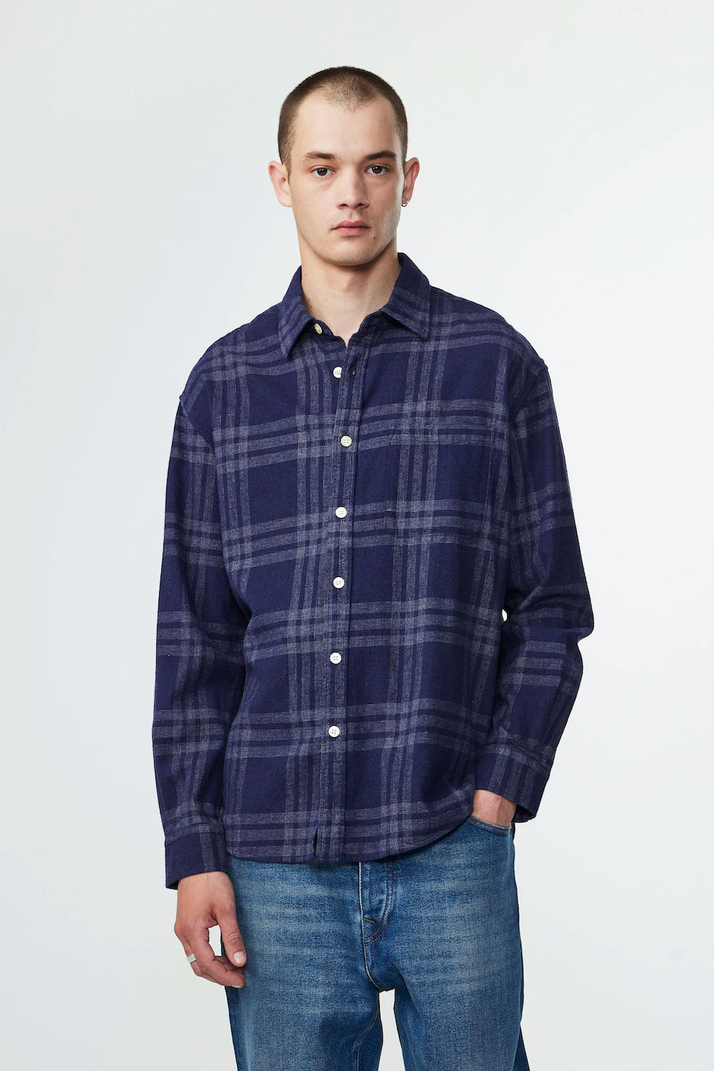Long sleeve shirt crafted in a smooth organic cotton flannel twill. Features a subtle drop shoulder for a relaxed, laidback fit. Topped with classic shirting buttons.