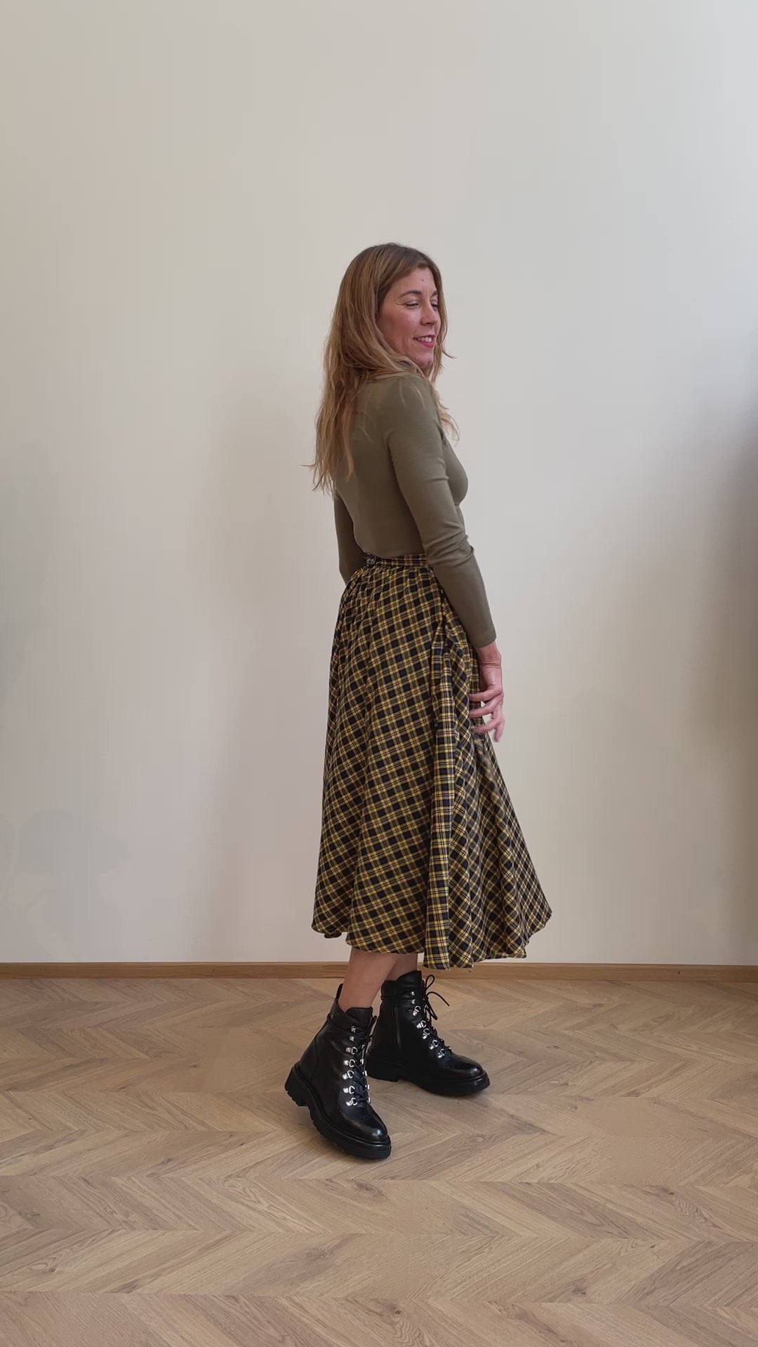 Make a bold statement with the golden plaid midi skirt, a timeless piece that combines classic plaid with a modern silhouette. The rich mustard and black check pattern adds a touch of vintage charm, while the full A-line design gives it a graceful flow with every step. Crafted from a soft, comfortable cotton fabric, this skirt is perfect for both casual and dressed-up occasions. Pair it with boots and a simple top for a sophisticated, effortless look that transitions easily from day to night.