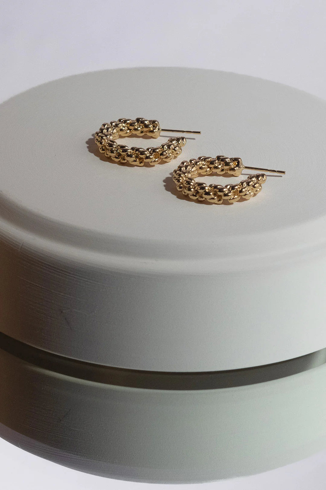 The ENNATO Jewelry ESTHER Earrings radiate understated glamour through their distinctive textured design. These creoles embrace bold volume while maintaining an impressive lightness when worn, striking an elegant balance between presence and comfort. Finished with 24k gold plating, they capture and reflect light with remarkable brilliance, adding a sophisticated accent to any ensemble. A refined choice for those who appreciate jewelry that combines artistic texture with wearable elegance.