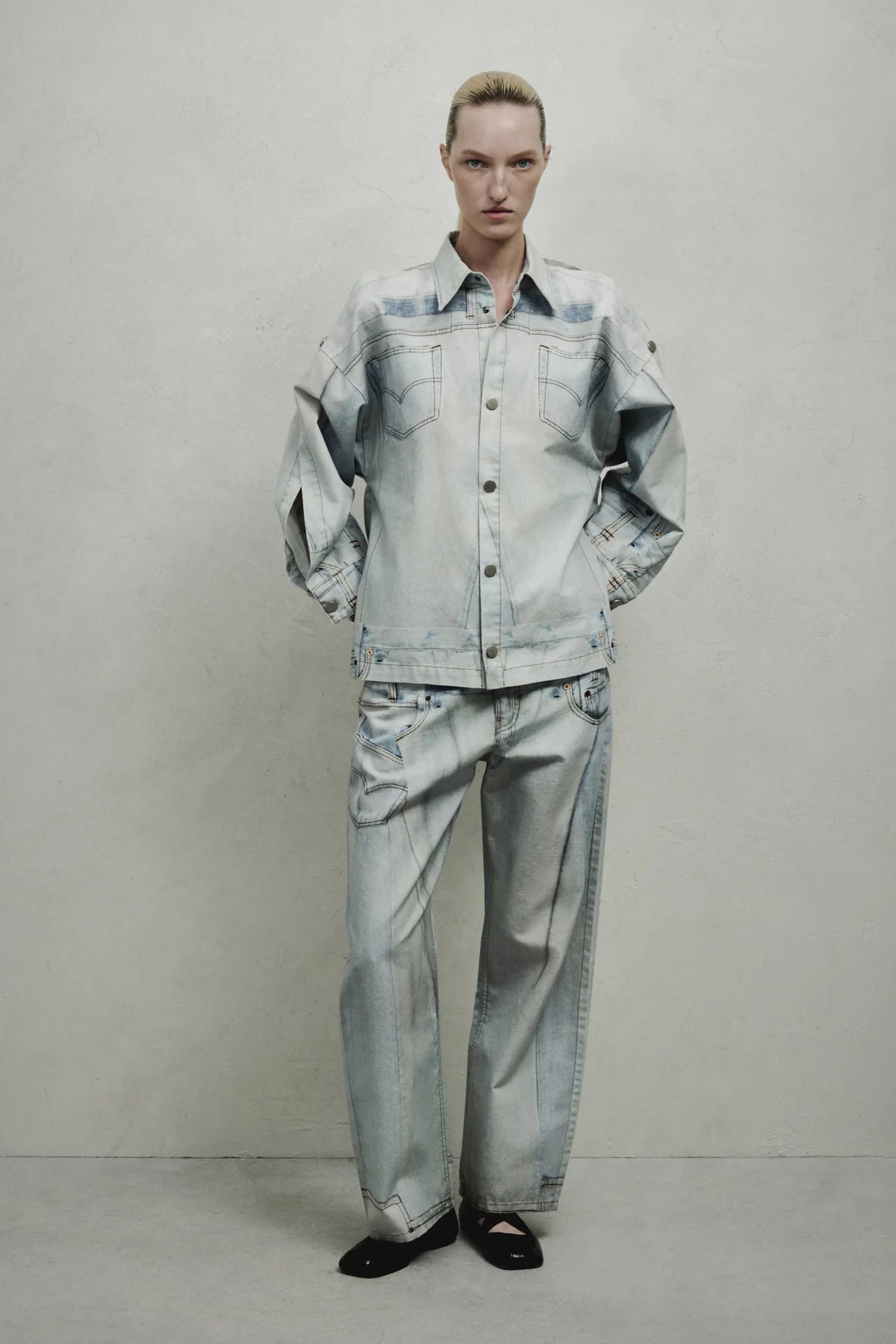 Crafted from pure cotton, this shirt features an ingenious denim trompe l'oeil print that delivers visual intrigue without weight. The classic collar frames the face elegantly, while innovative snap button closures at the shoulders and arms offer unexpected styling versatility. Piercing-effect rings punctuate the cuffs with refined edge. A sophisticated piece that balances timeless tailoring with contemporary design details.