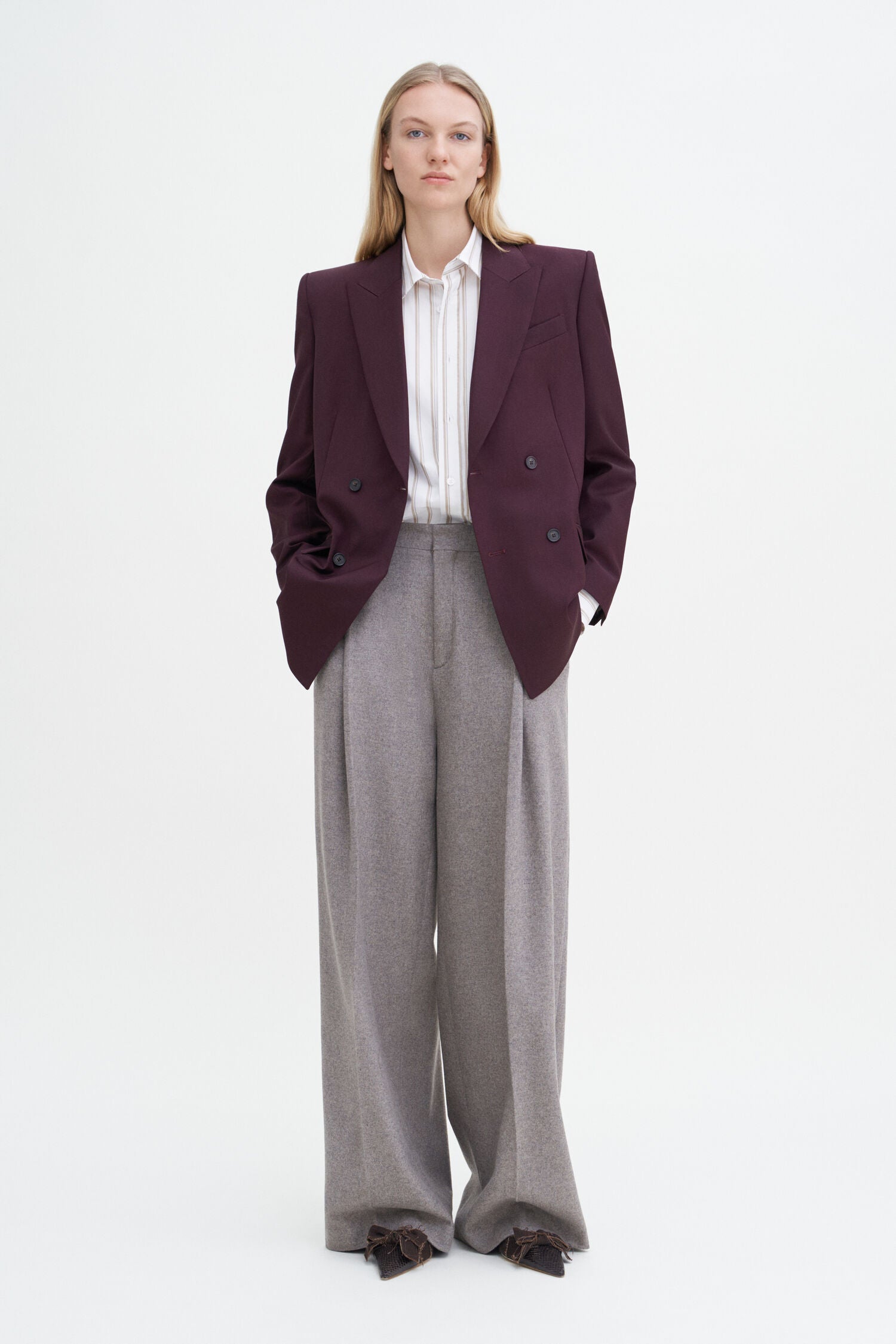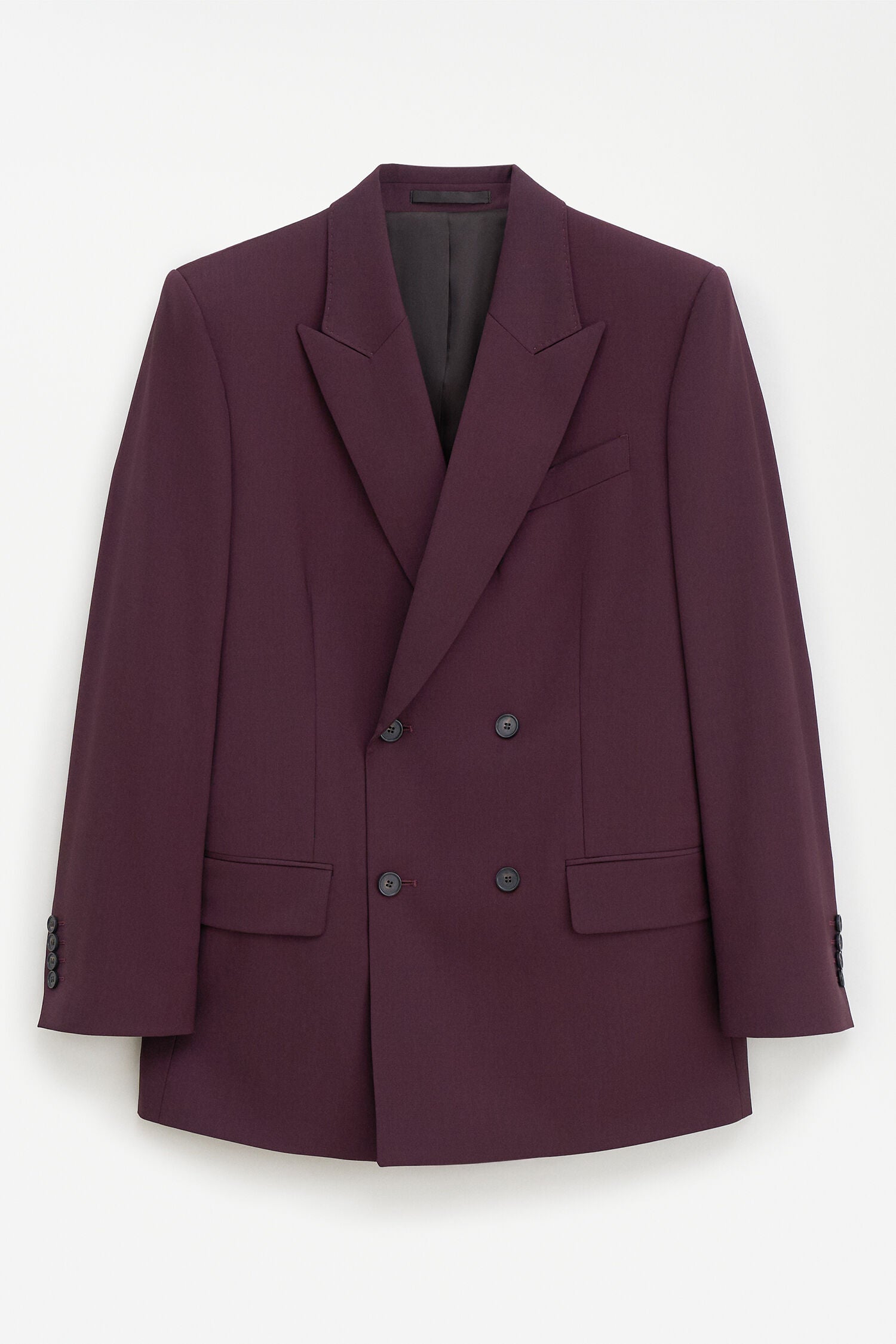 The Double Breasted Blazer is designed with a relaxed fit, broad shoulders and below seat length. Tailored from burgundy merino suiting wool with slight stretch, and fully lined. Wear with the Emma Wool Trousers for a full suit look.