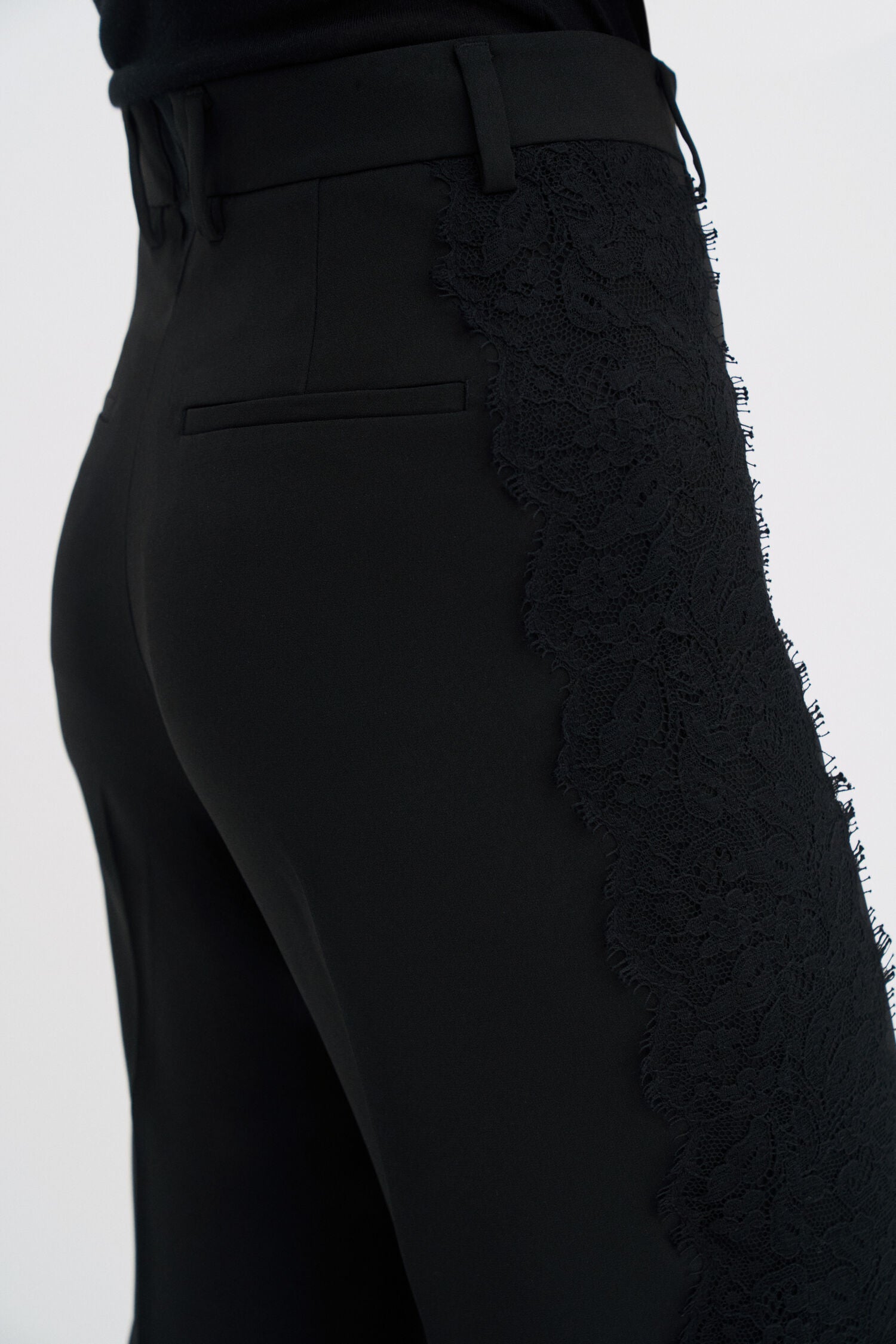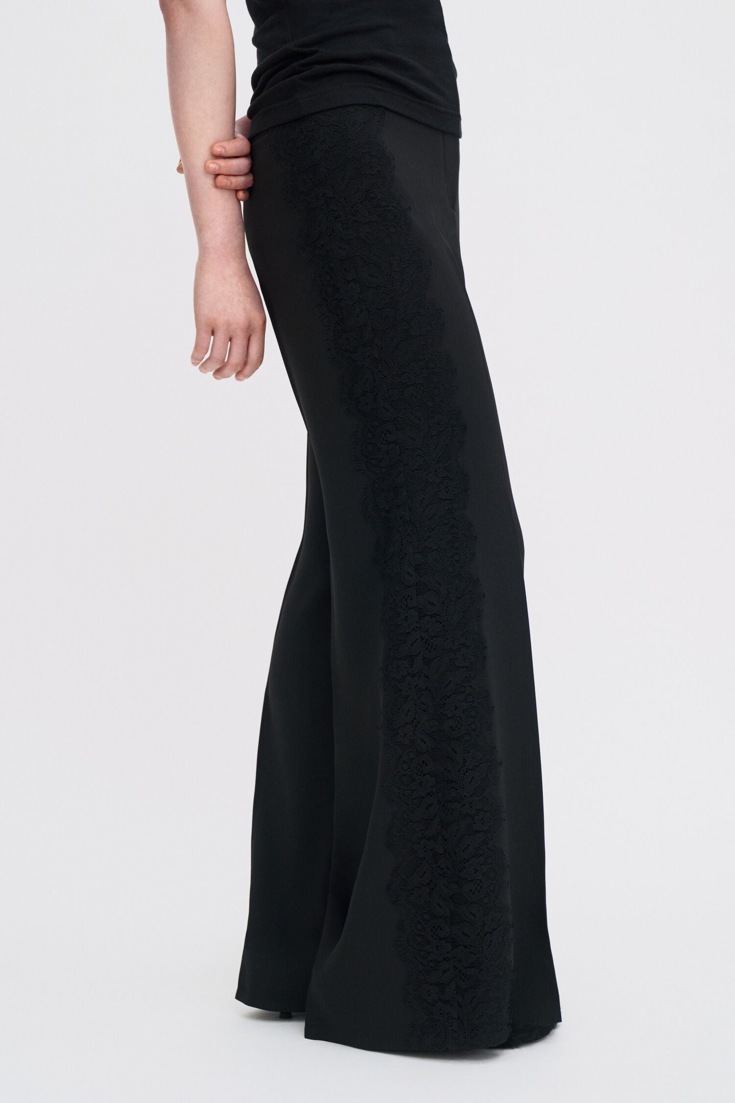 The Evie Lace Trousers have a high waist and extra long length with a flared leg, in a matte draped crepe fabric. An elevated choice for evenings and events, which can be paired with the Lace Shirt.
