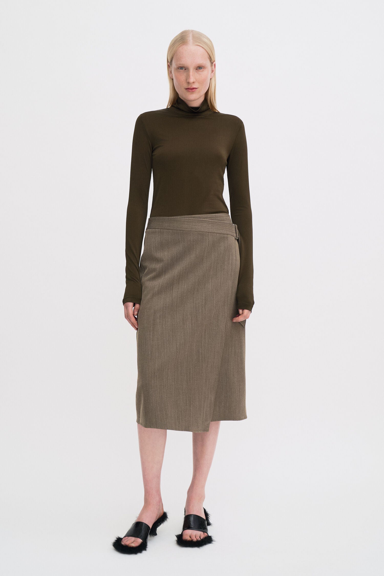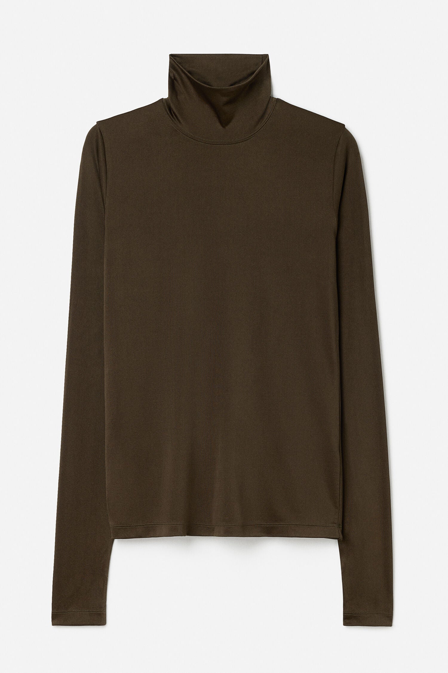 A slim turtleneck top in a shiny midweight Naia™ acetate stretch blend. Style it as an elegant base layer, or tuck it into a long skirt.