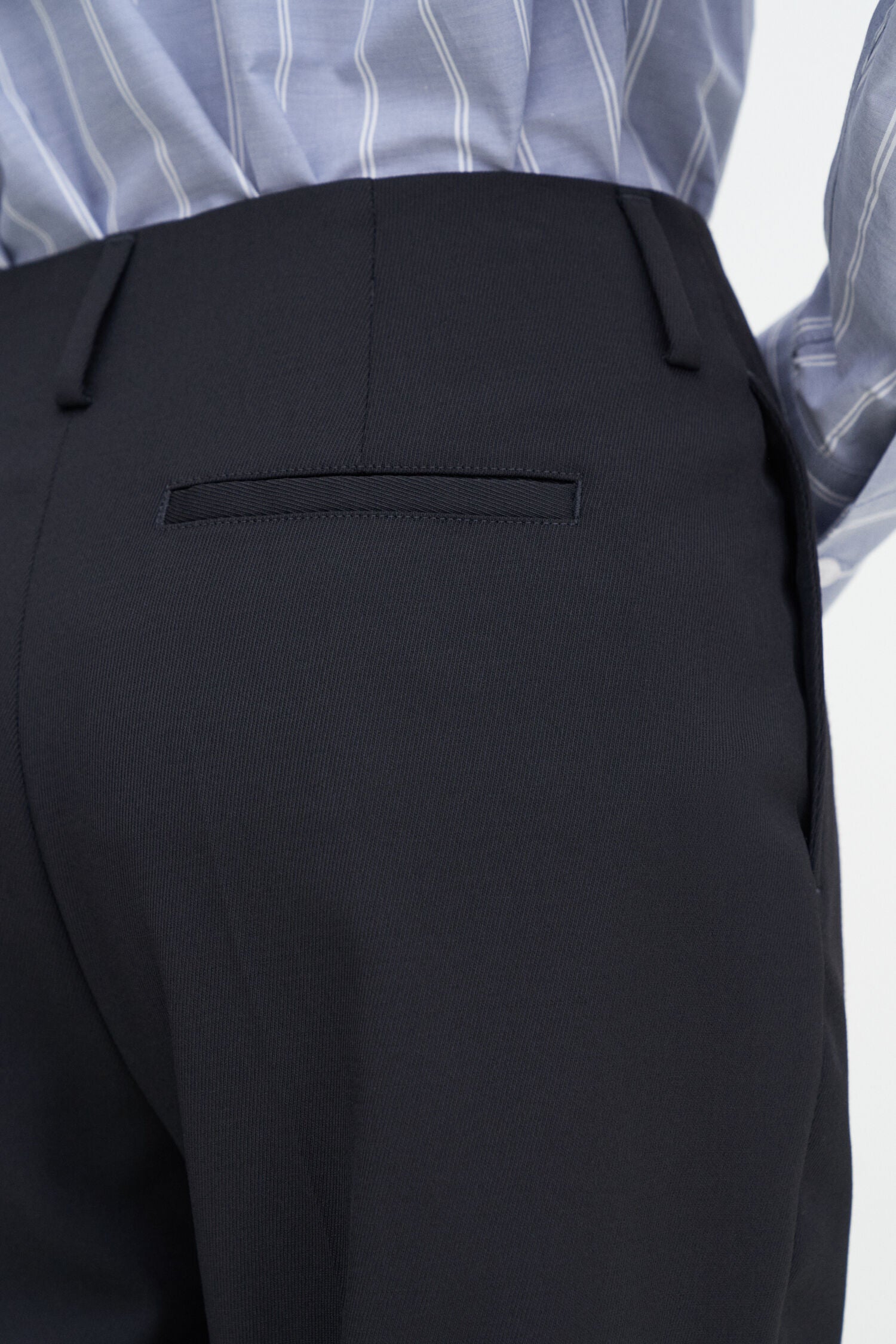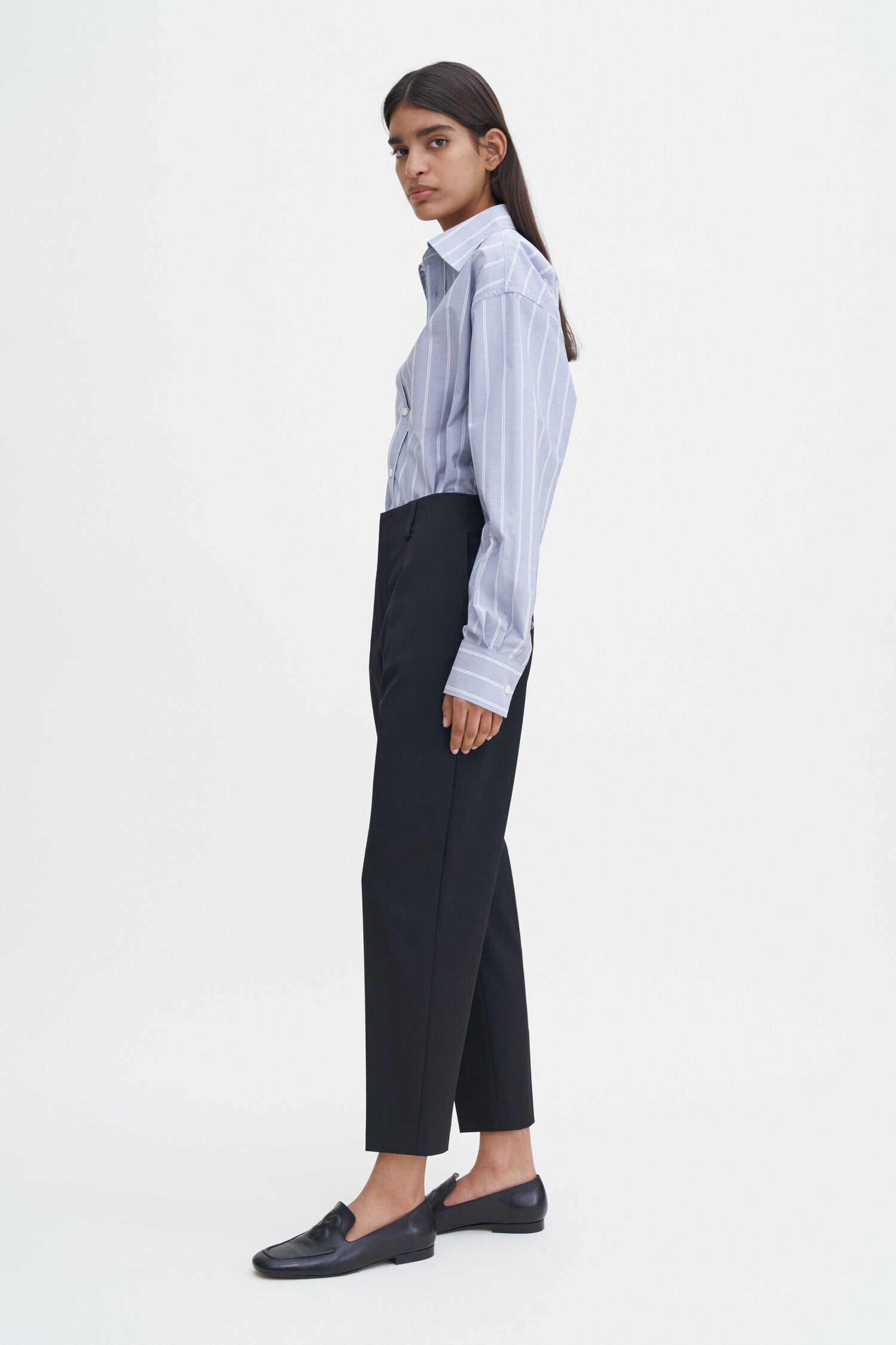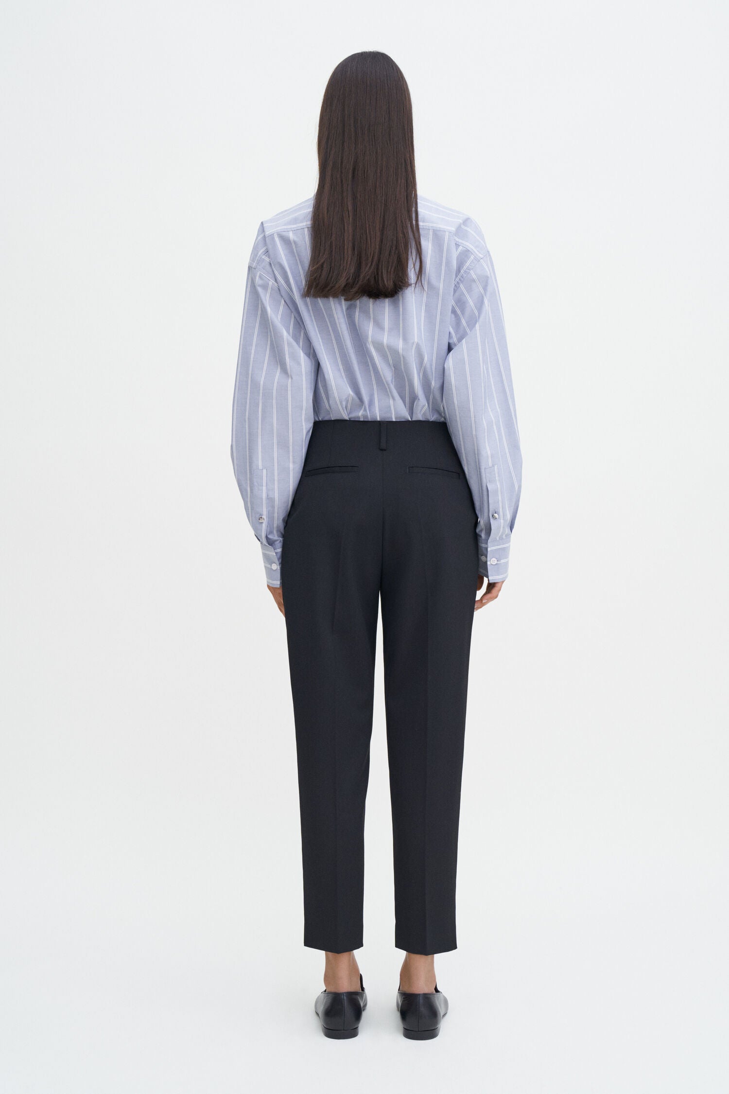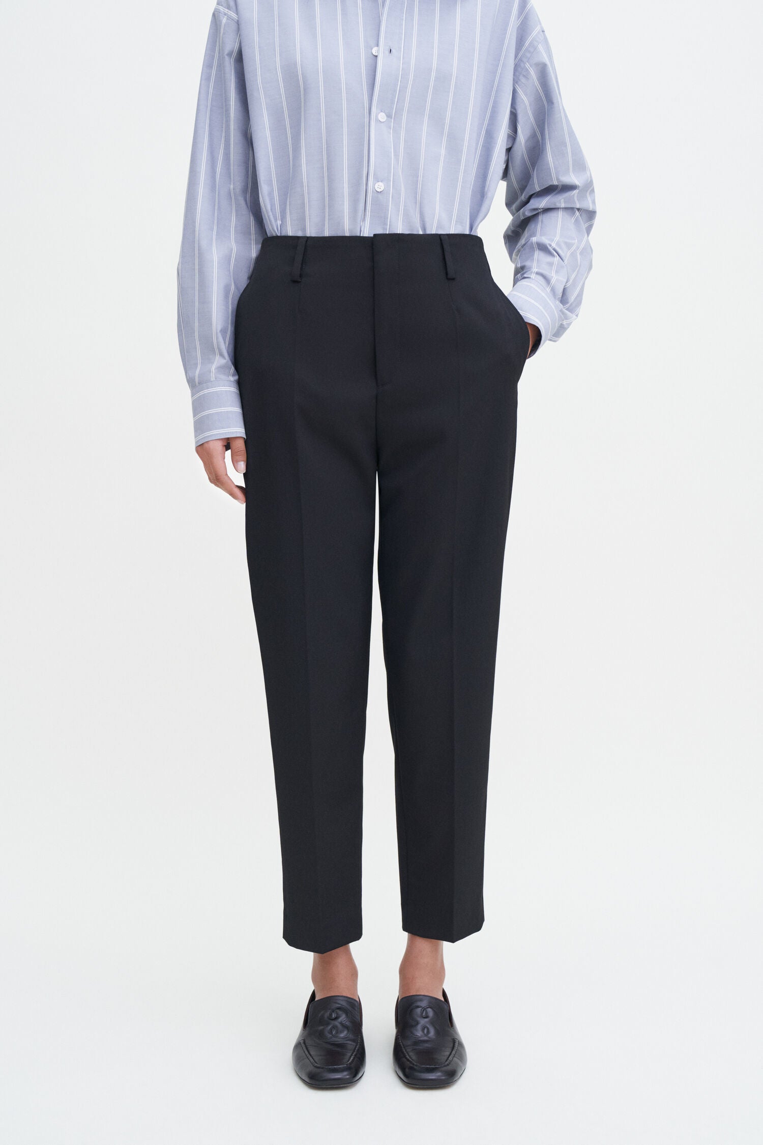 The Karlie Trousers are designed with a cropped length, high narrow waist and loose tapered leg shape. Tailored from a merino wool suiting blend with slight stretch in black. Style with a classic shirt or sweater for a smart casual look.