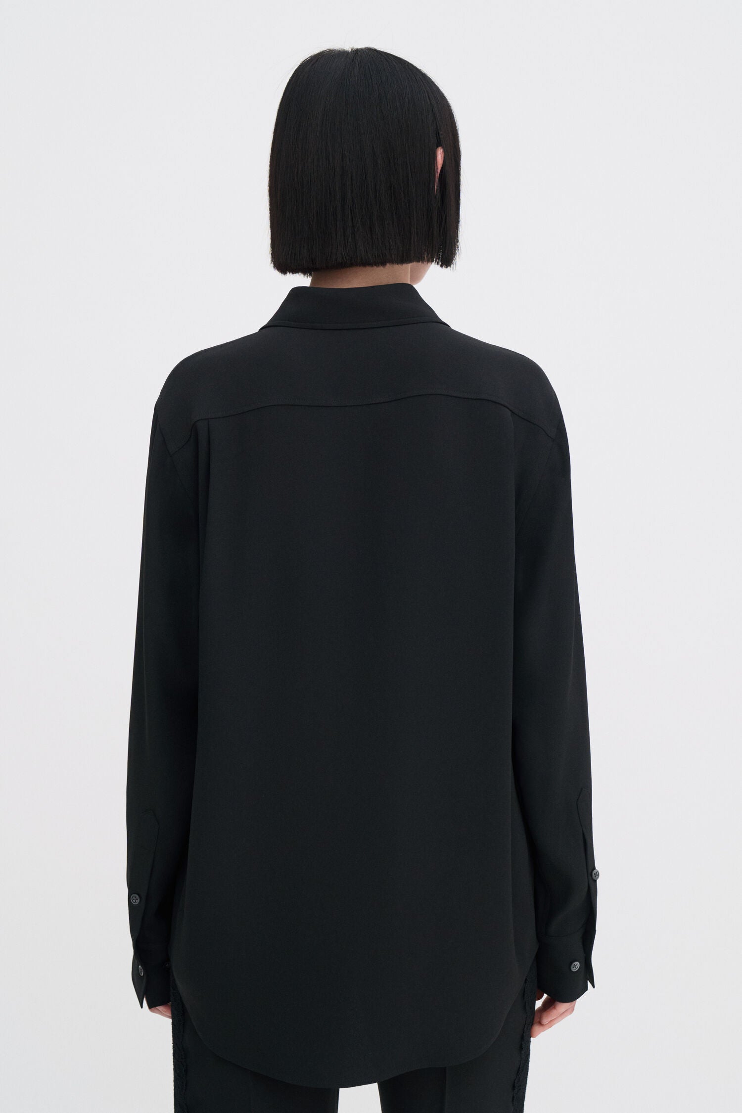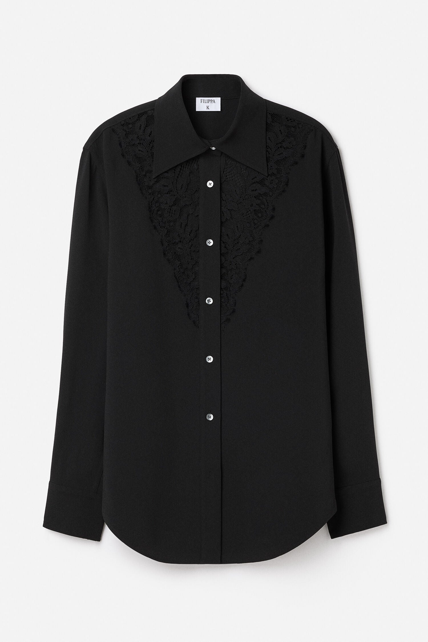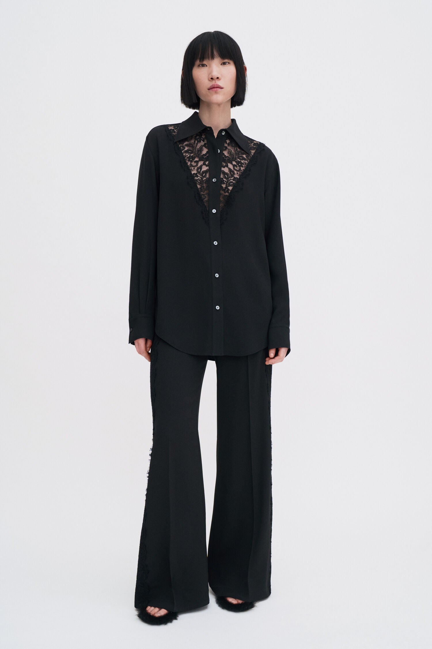 An oversized shirt made from a matte lightweight draped Naia™ acetate blend. Designed with classic shirting and lace details. An elevated choice for evenings and events, which can be paired with the Evie Lace Trousers.