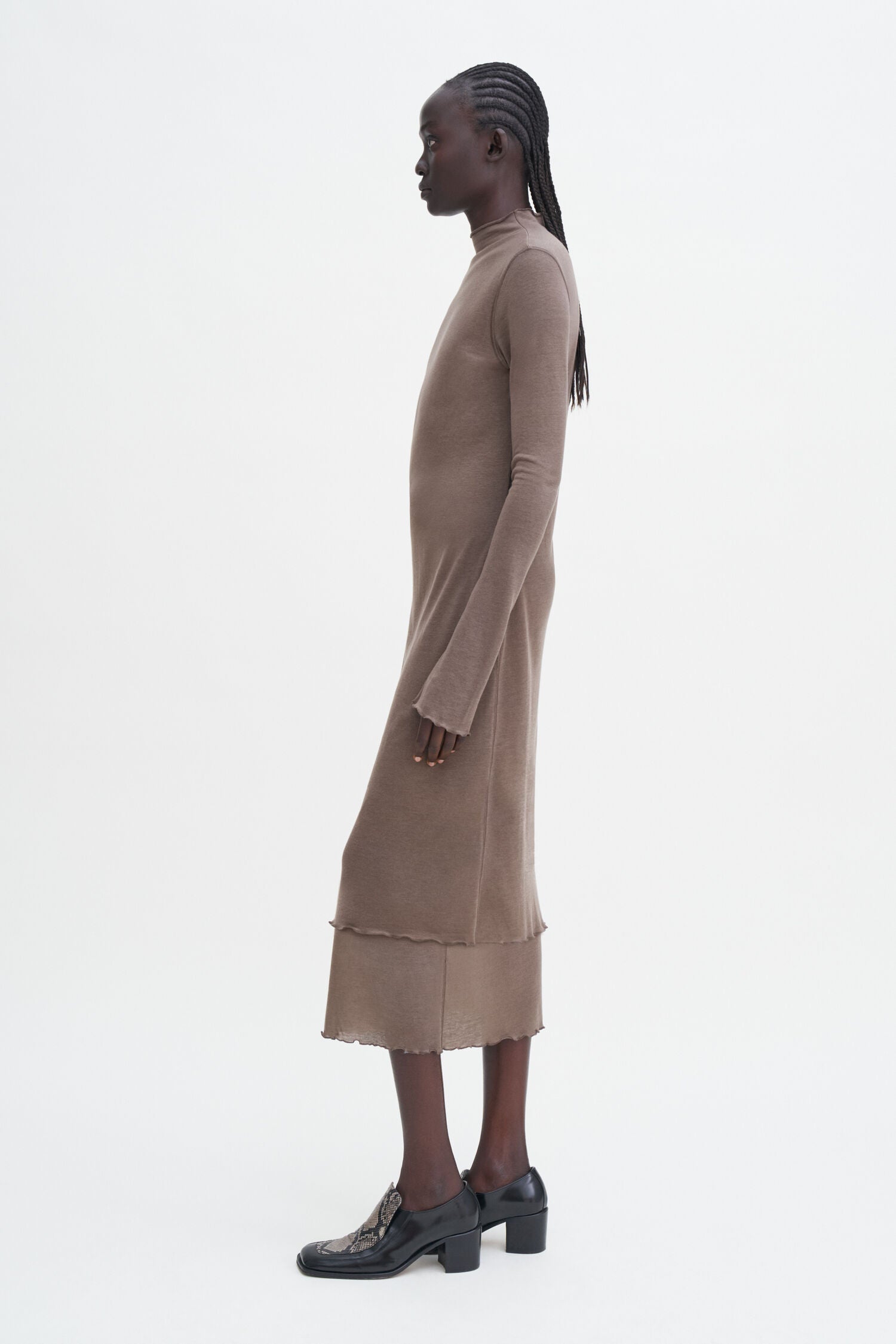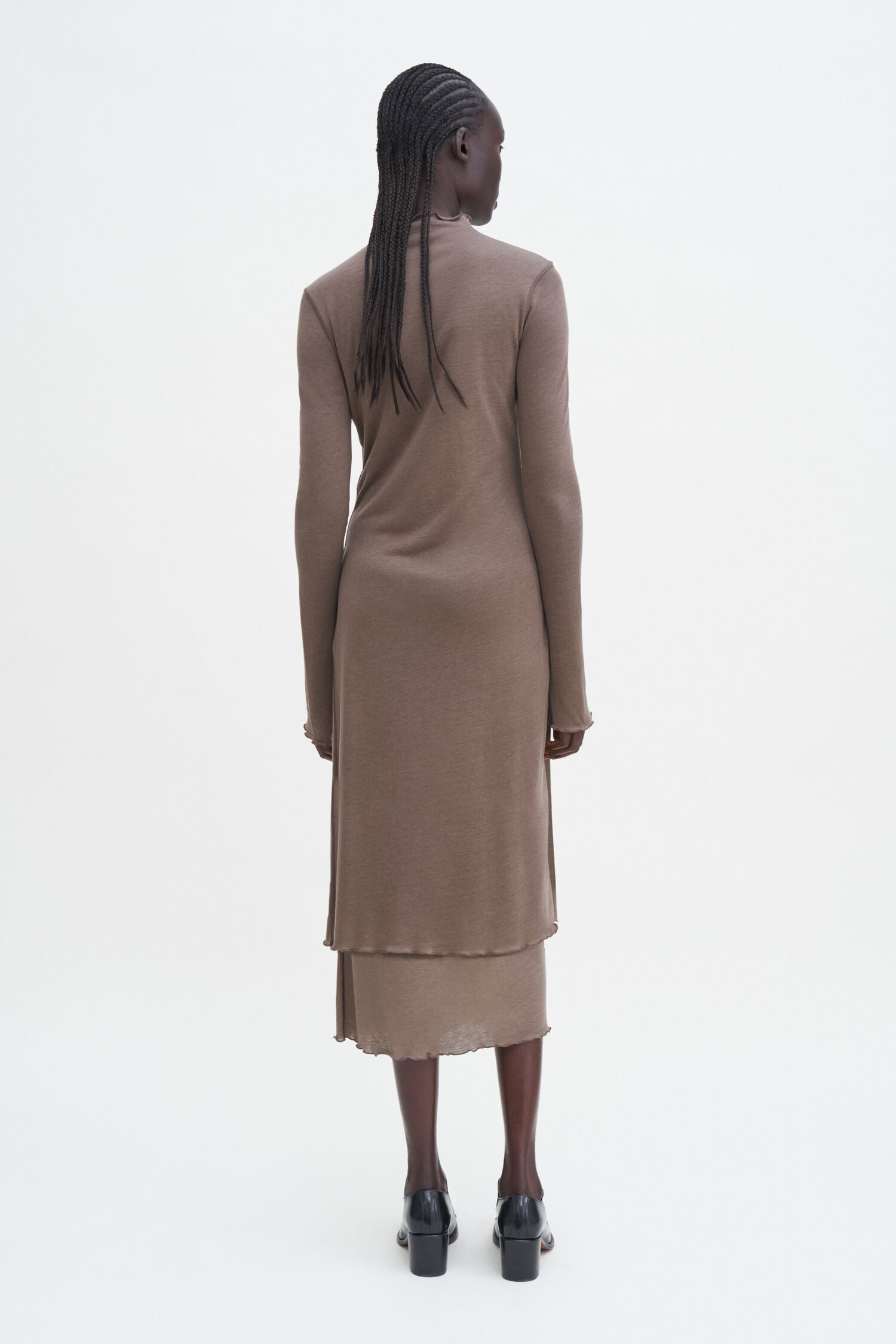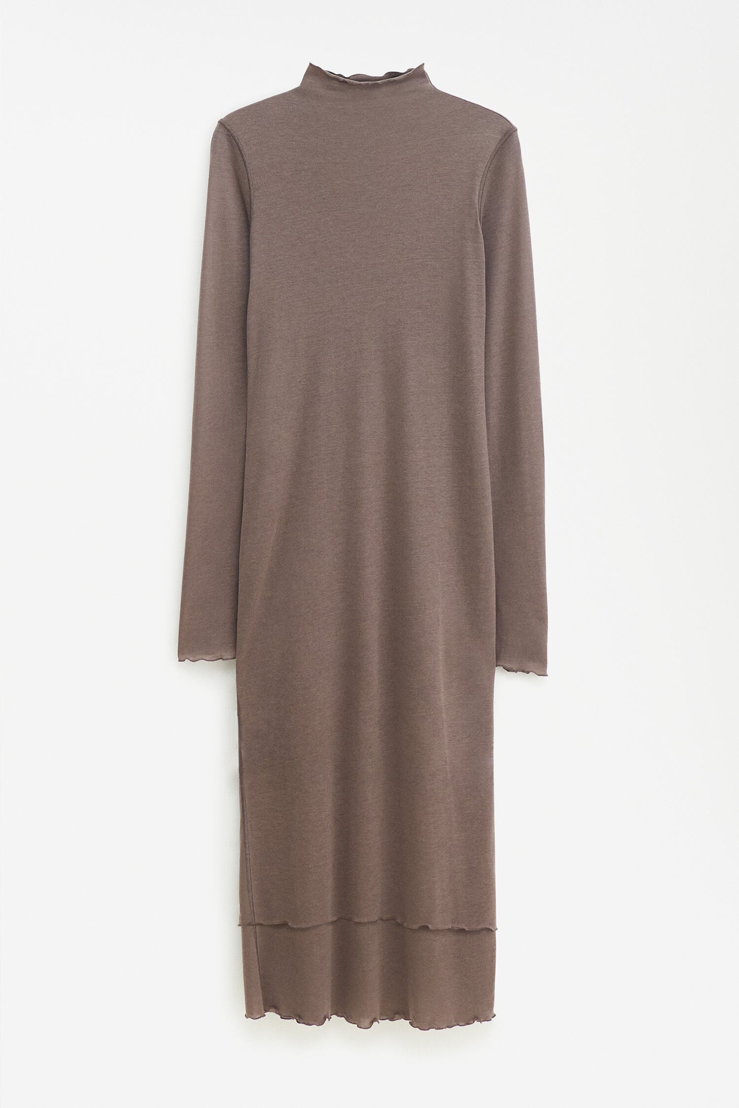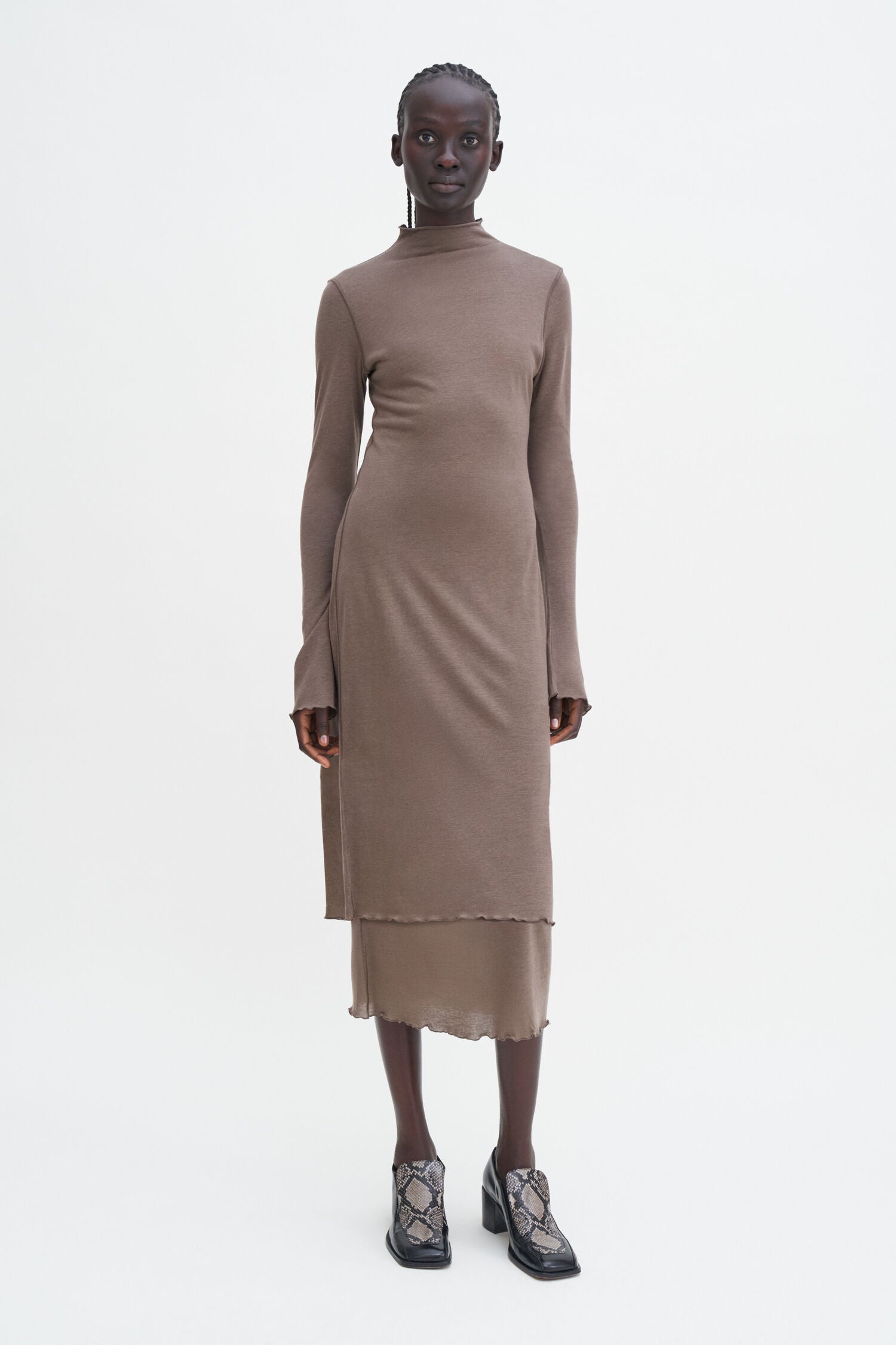 The Layered Frill Dress has a slim fit knit from a lightweight cashmere and TENCEL™ blend jersey in driftwood brown. Designed with frilled edges at the mock neck collar, trumpet sleeves and midi-length hem. A versatile piece, it can be styled with sandals, loafers or heels.