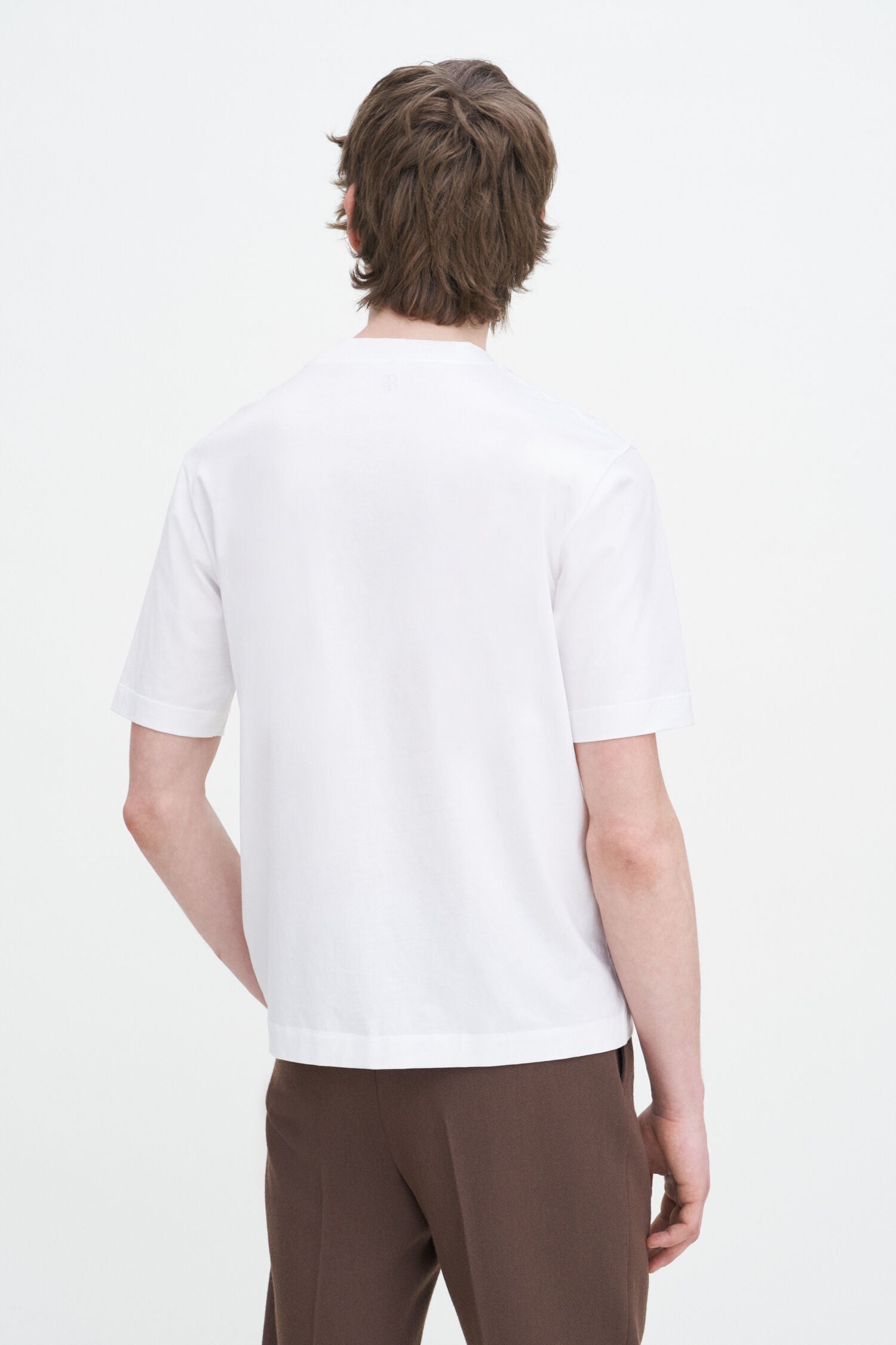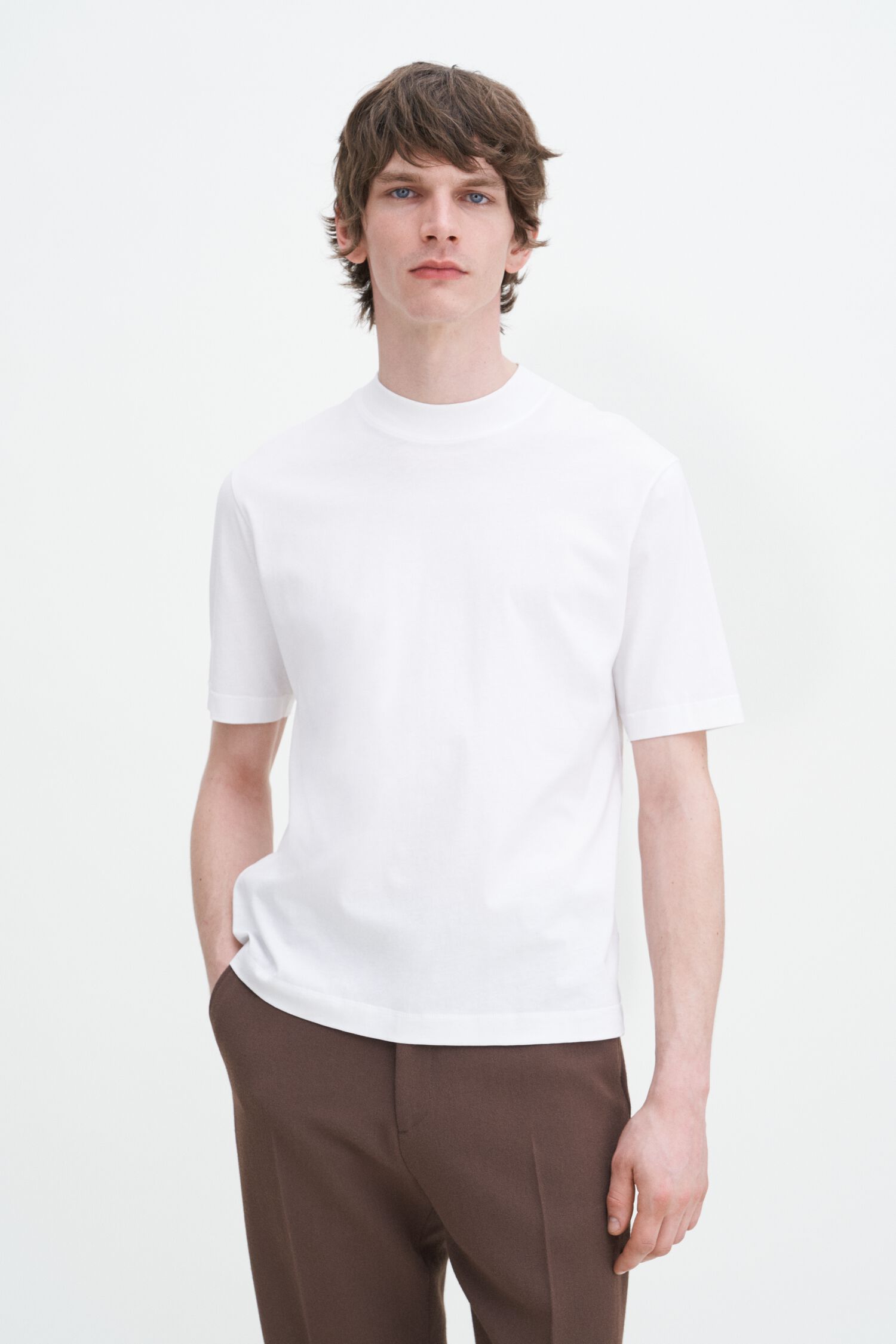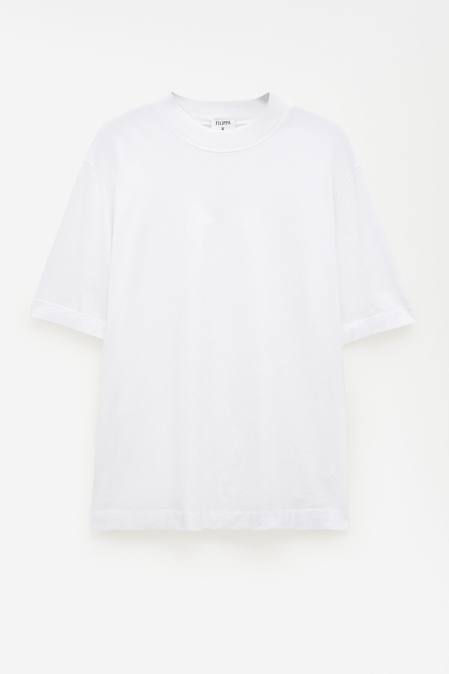 The Mock Neck Cotton Tee in white has a regular fit in mid-weight organic cotton jersey. Designed with a mock neck collar, baseball-style stitching, and the Filippa K 93 Monogram in tonal embroidery at the centre back of the neck.