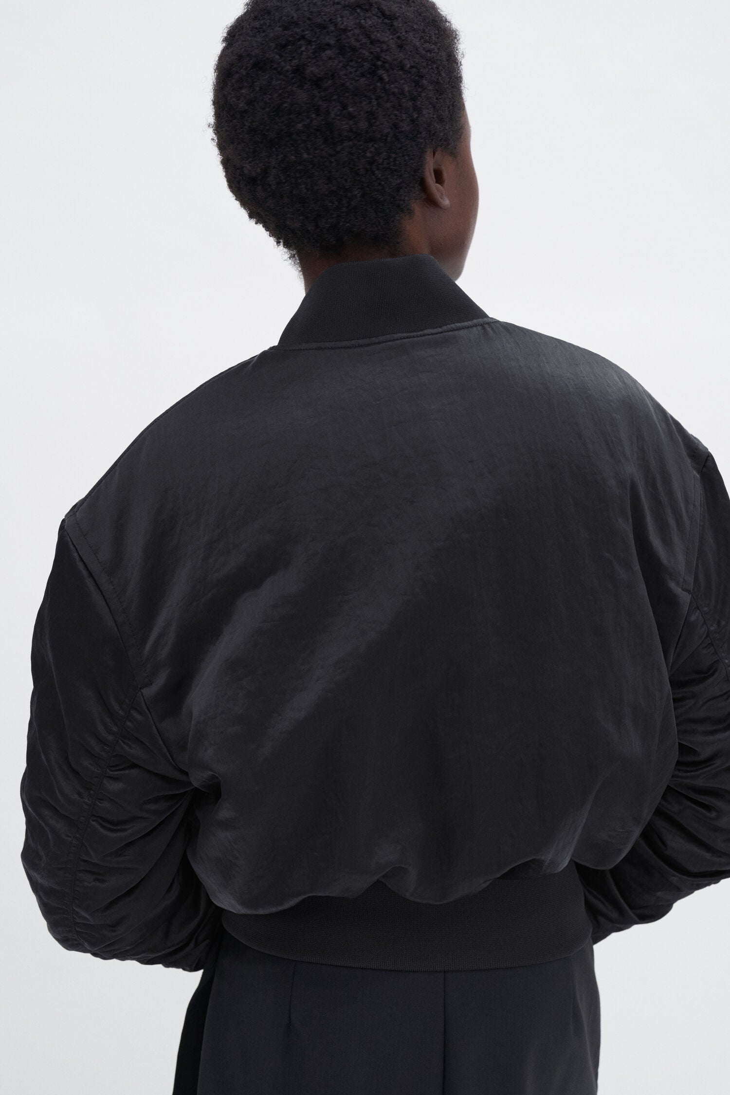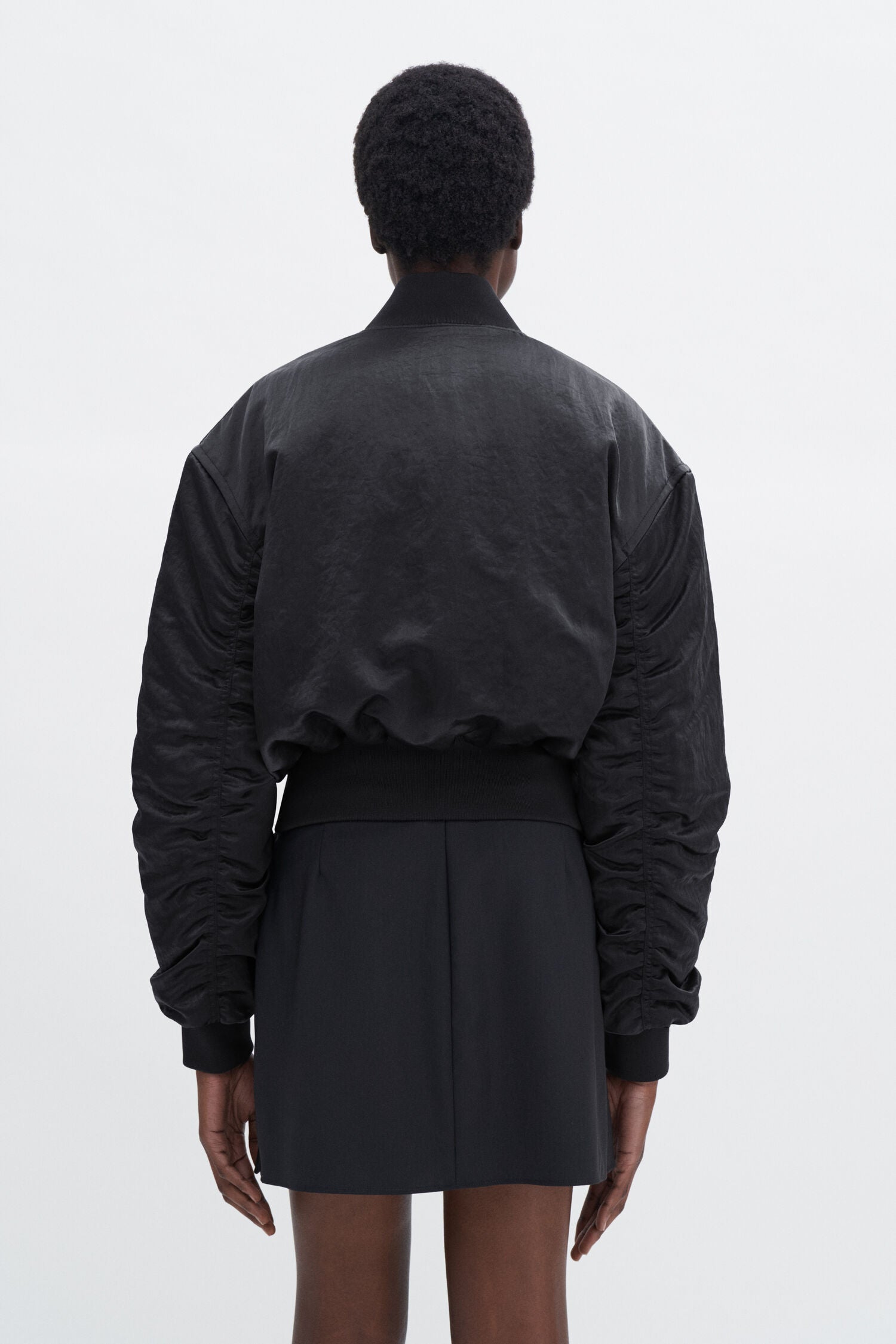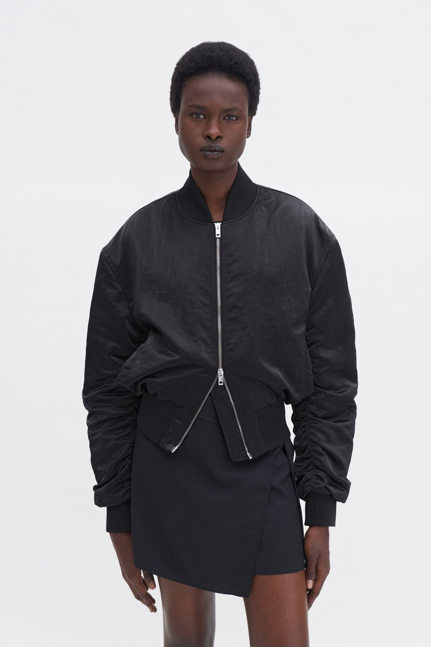 Nylon zip jacket with a slightly crinkled surface lightweight padding. Designed with a classic bomber silhouette: an oversized fit, dropped shoulder and cropped length. Throw it on over casual looks, or use it to balance out more formal pieces.