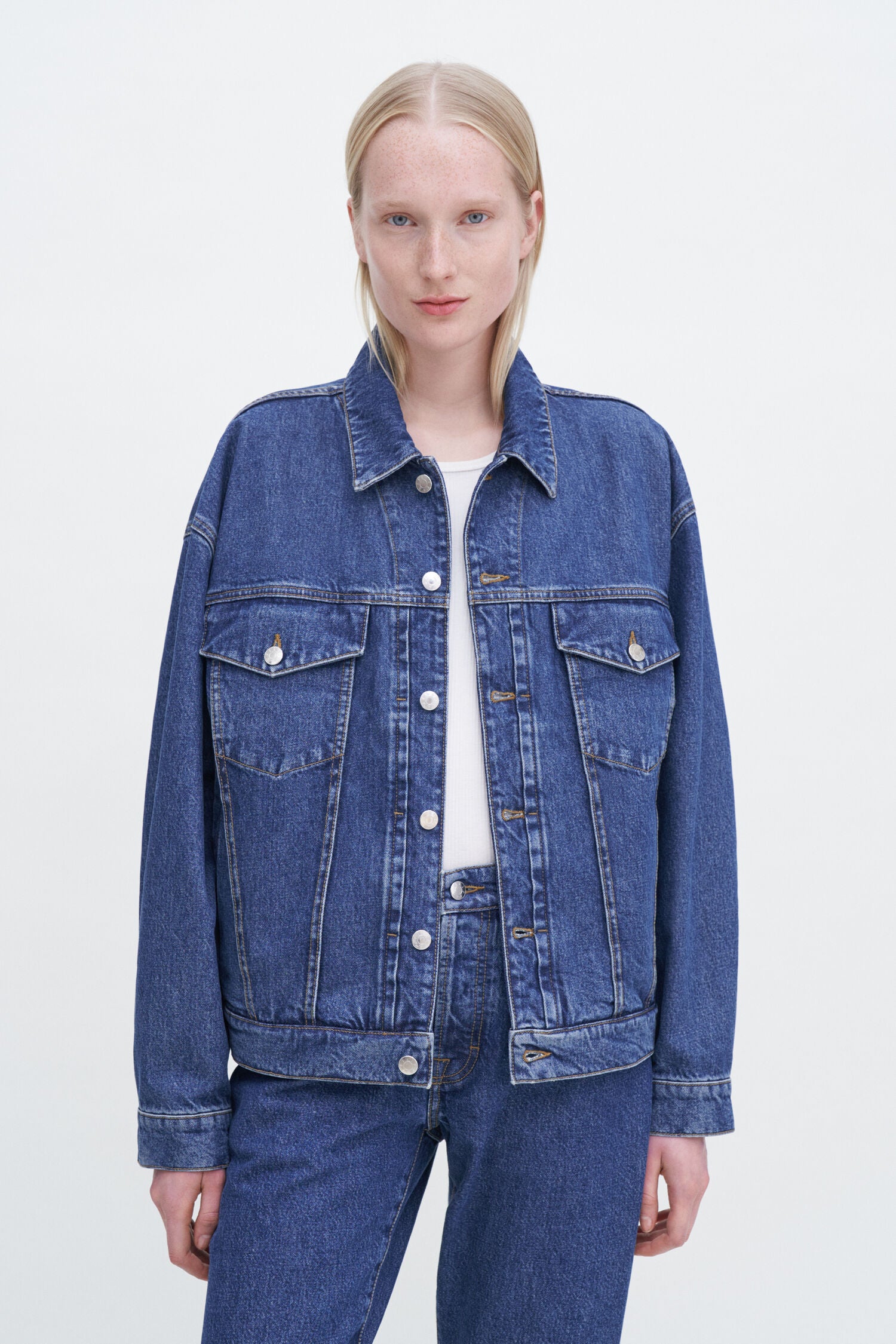 Relaxed jean jacket with a relaxed boxy fit, dropped shoulder and hip length. Made from a non-stretch denim blend of organic and recycled cotton with TENCEL™. Wear it with jeans for a coordinated look, or as an extra layer over dresses and skirts in the transitional months.