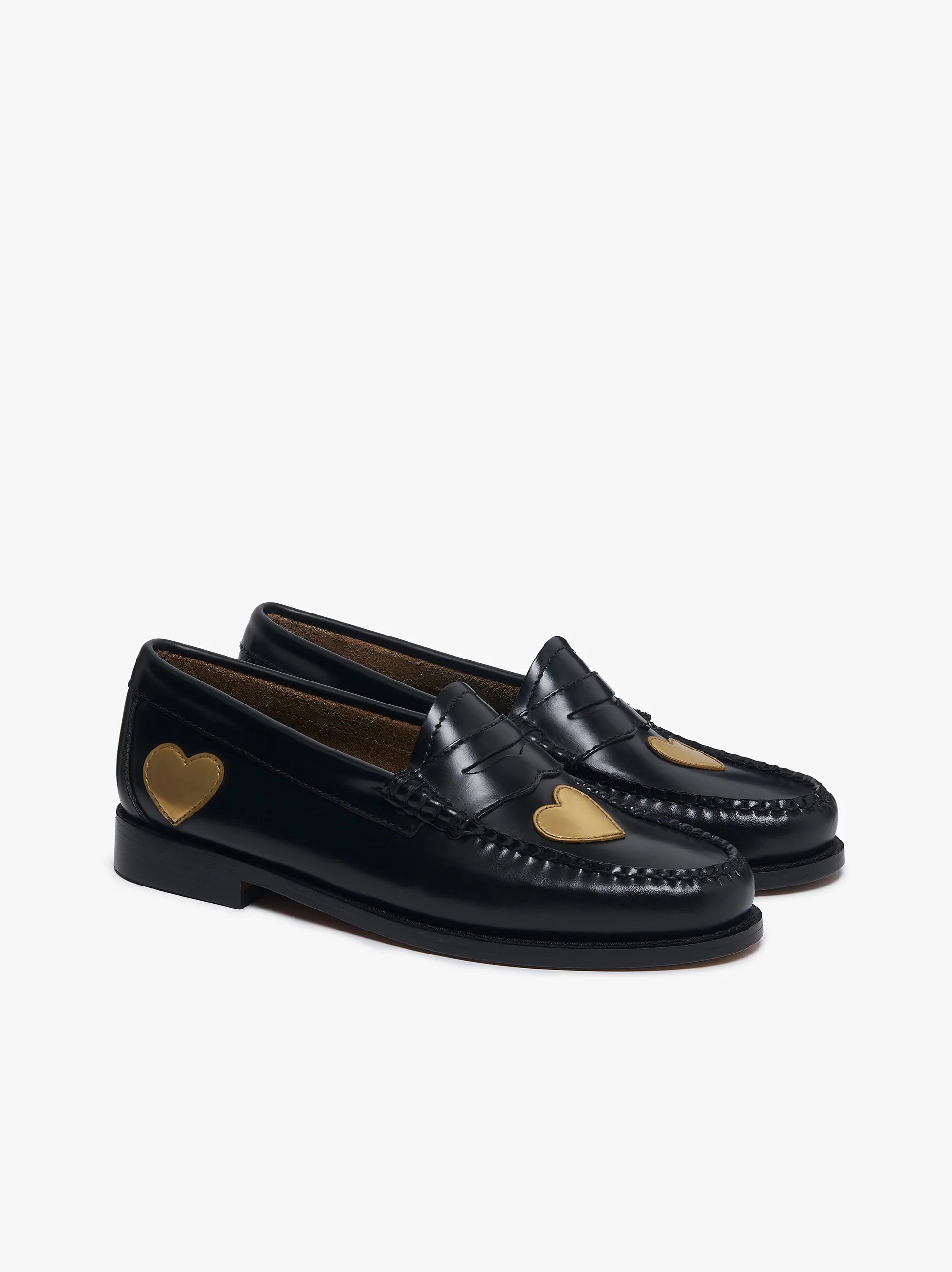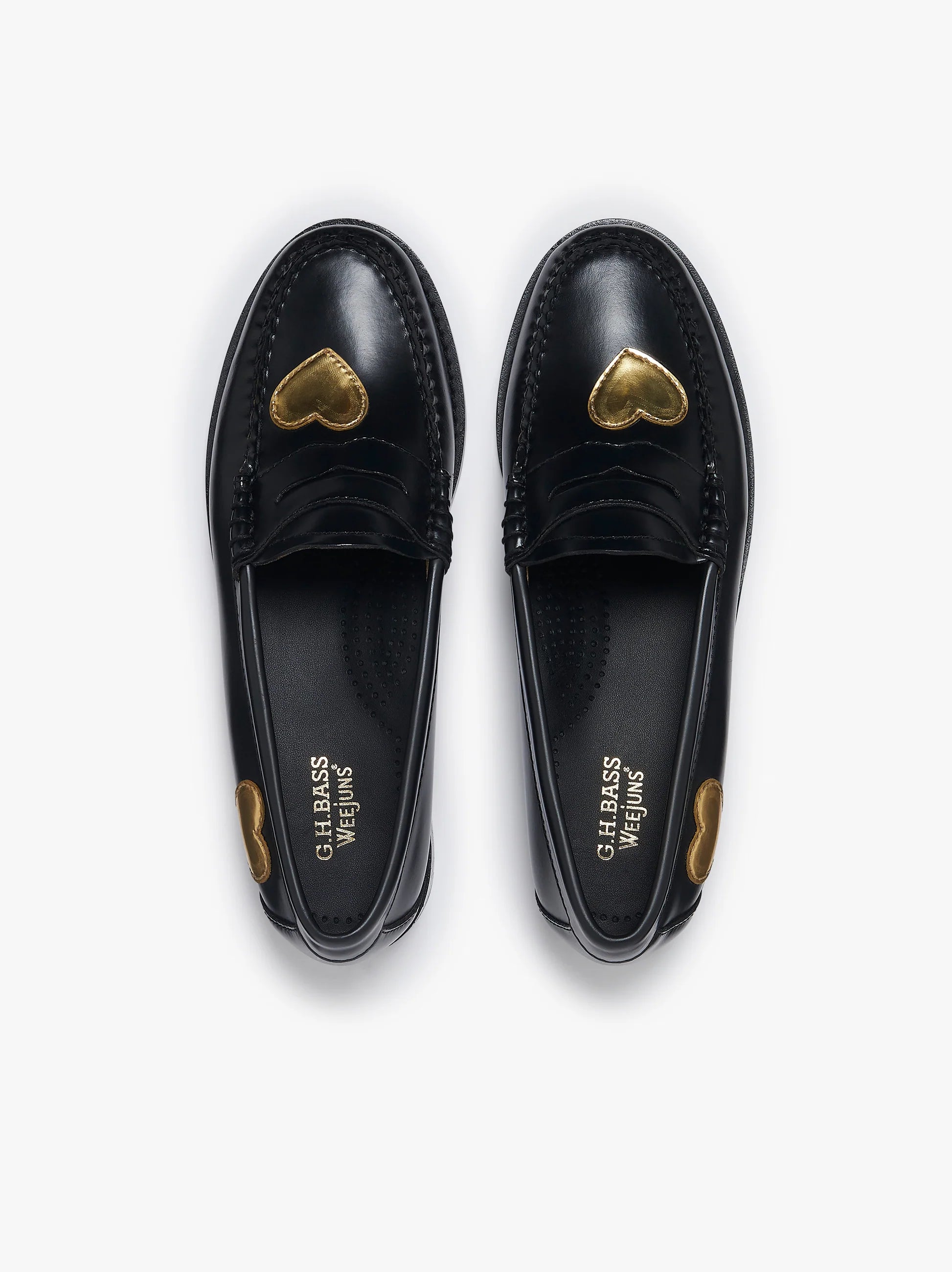 Meet the Weejuns penny love loafers, where playful glamour is combined with sophisticated charm. Crafted from polished black moc leather and adorned with golden hearts, these loafers celebrate style. Enjoy the comfort of a cushioned leather insole while durable welt stitching ensures lasting quality. Finished with a polished leather sole, these women's loafers will take you from day to night with ease. For the cooler spring days, style these penny loafers with a sleek midi skirt and a tailored blazer or with cropped jeans and a chunky knit for a stylish yet cosy look.