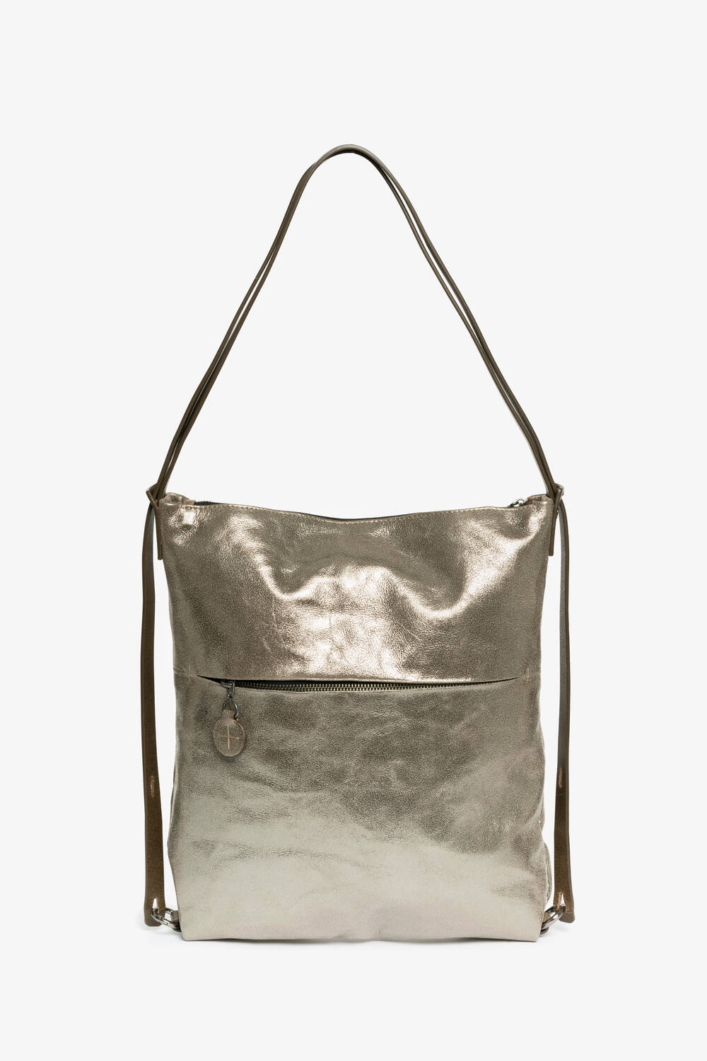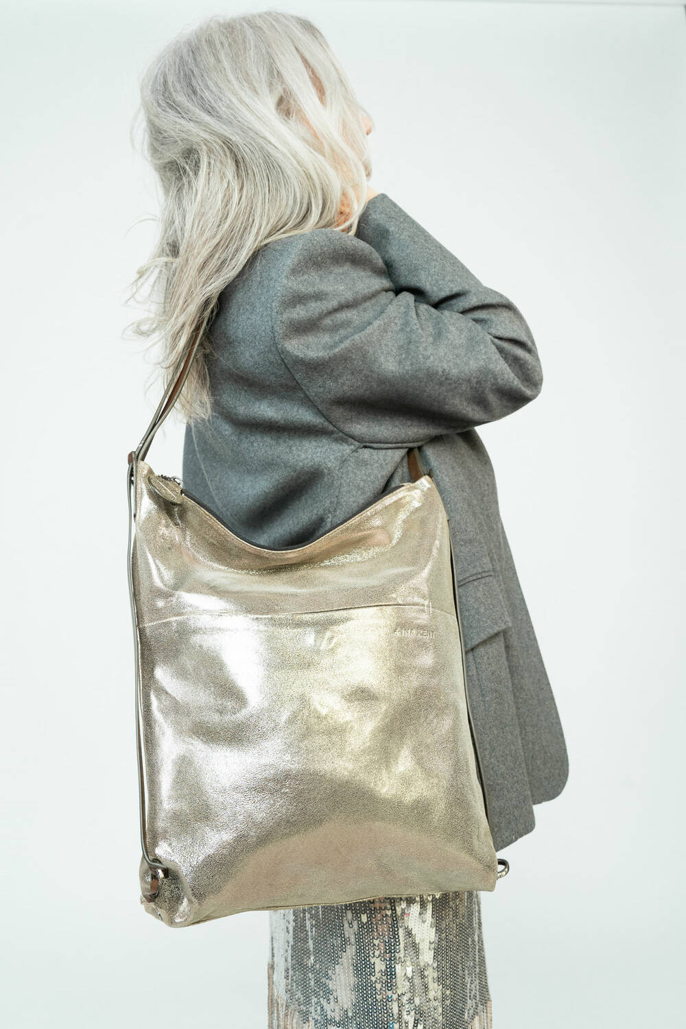 Simple metallic platinum leather tote bag with variable, comfortable, vegetable-tanned leather strap and smart interior. SHER ed.1 can effortlessly be transformed into a backpack or crossbody bag. Roomy enough for essentials and a 13'' laptop.