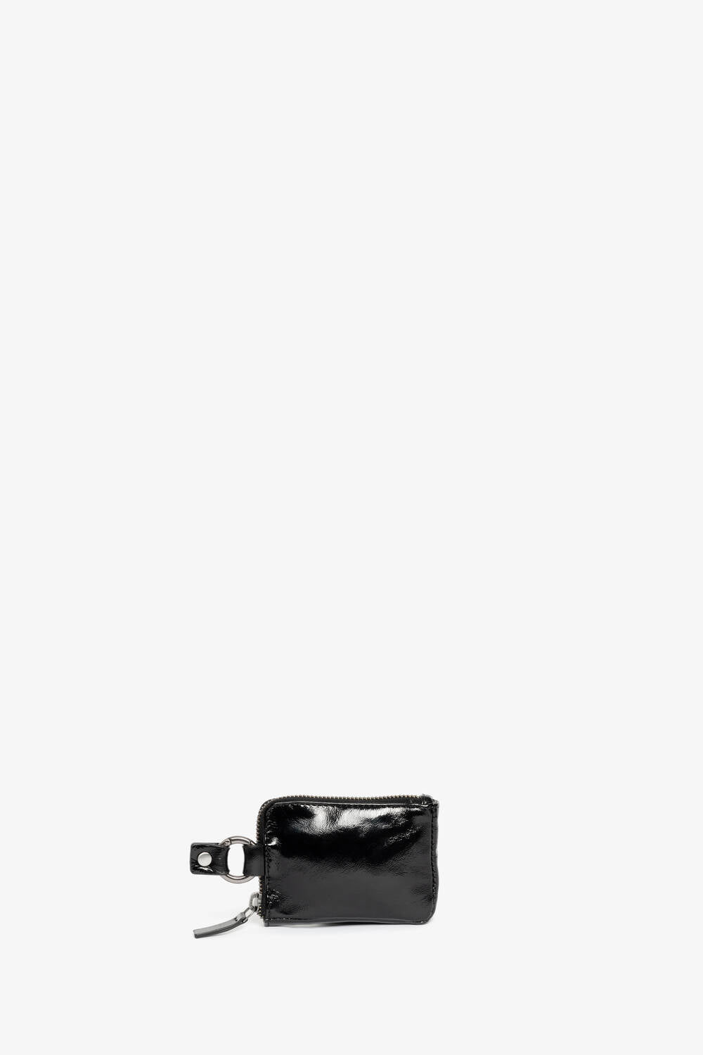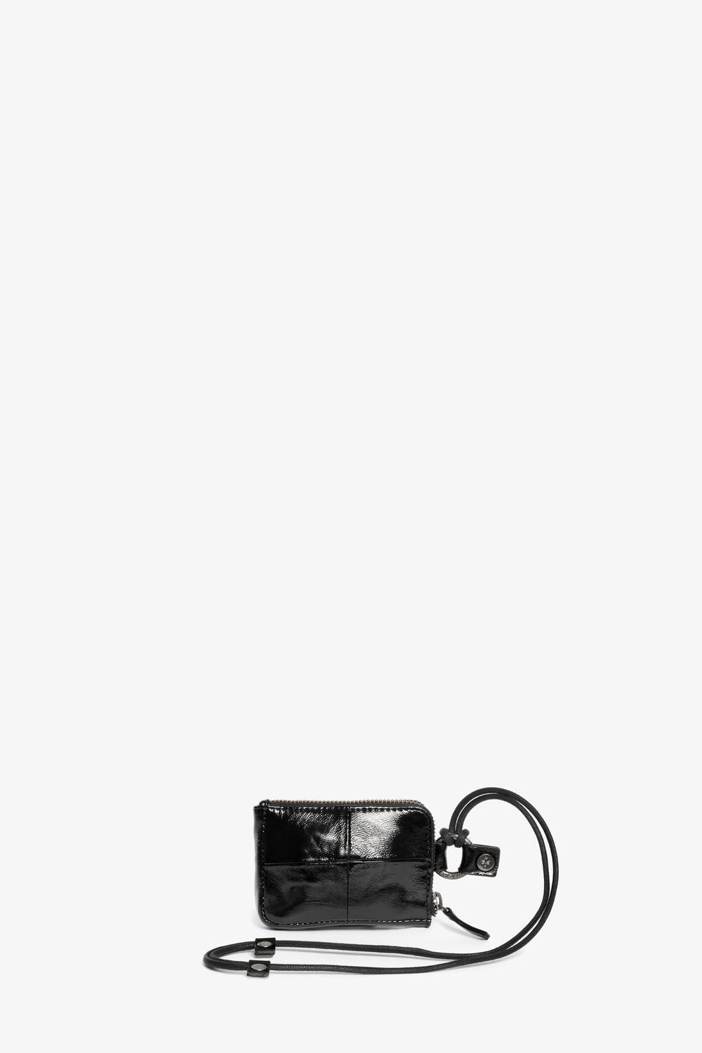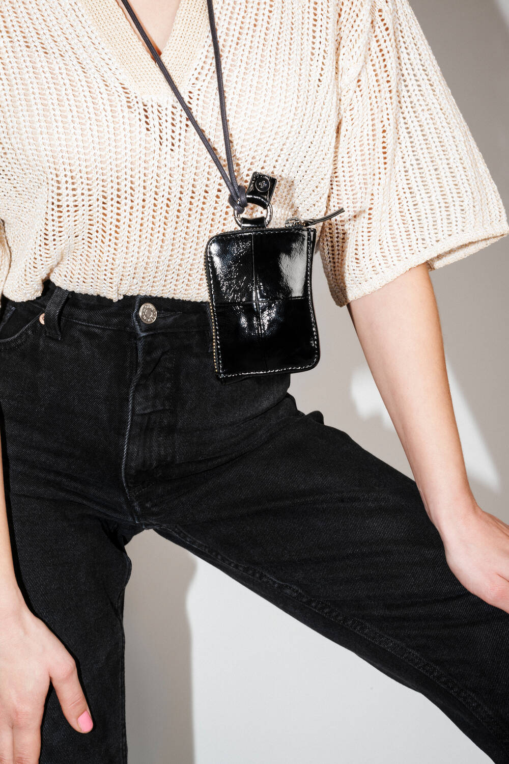 The practical mini wallet made of patent black leather. With the INA KENT carabiner ring, X.LOMI ed.2 can be worn as as pouch around the neck and also easily be transformed into a bag charm. The interior offers space for cards, banknotes and coins. The adjustable cord strap makes it the ideal companion for long days and nights, that keeps your essentials ready to hand.