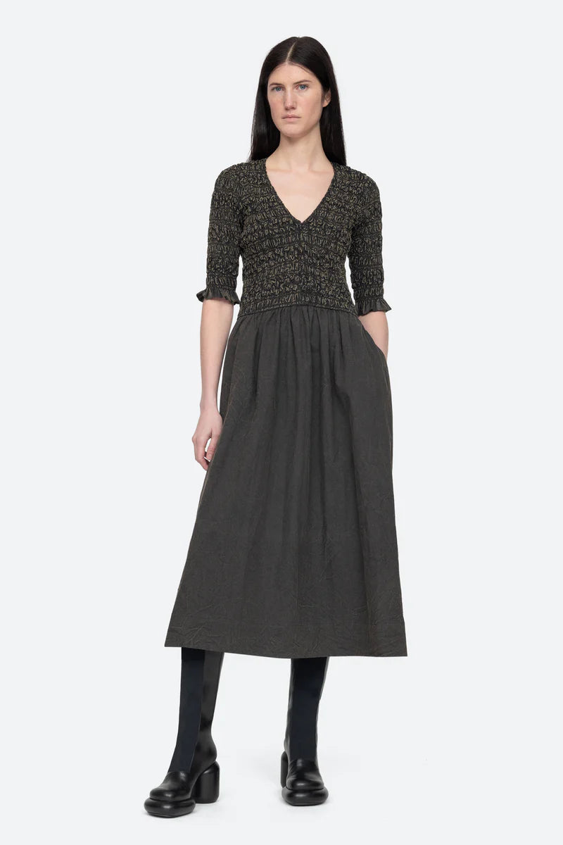 The Juni garment dye v-neck dress features a smocked bodice and full skirt.