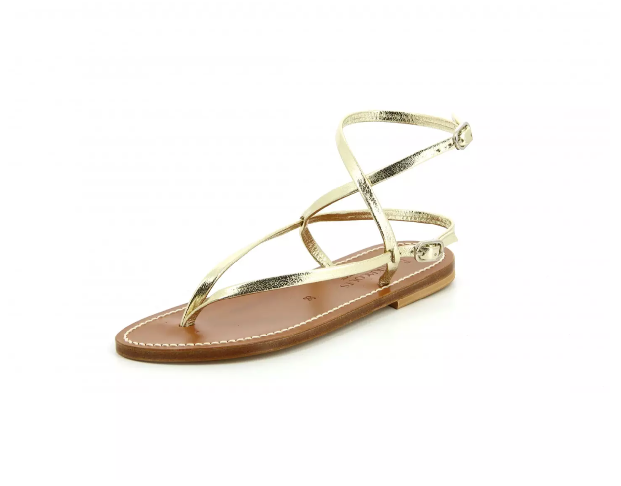 Flat leather sandals with between-finger strap and cross-over straps. Double buckles to fit on your feet