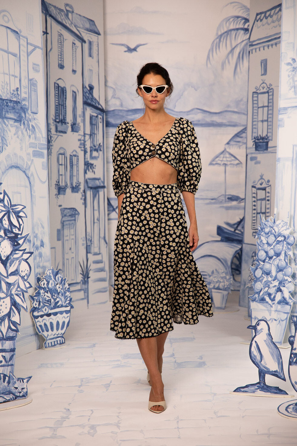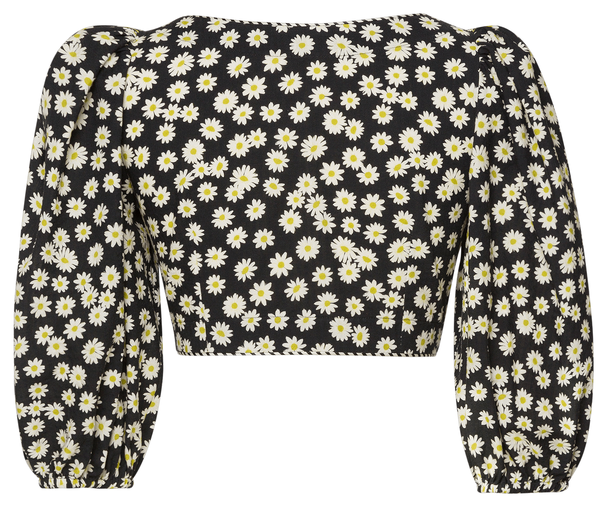 This blouse in a floral daisy print combines feminine charm with refined details. Designed in a strongly cropped, tailored silhouette, it features shaping darts that enhance the close-fitting cut and beautifully define the waist. The deep V-neckline is highlighted by decorative contrast trim along the neckline and seam lines, adding subtle refinement. Long puff sleeves with pronounced volume create dramatic balance, finished with elasticated cuffs for a softly gathered effect. Modern, confident, and distinctly feminine, this blouse is a standout piece for elevated summer styling.