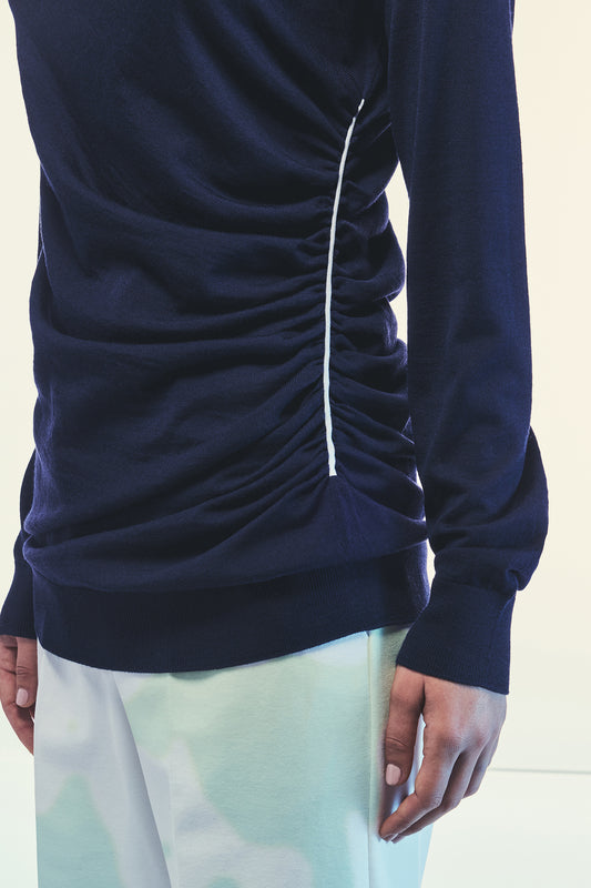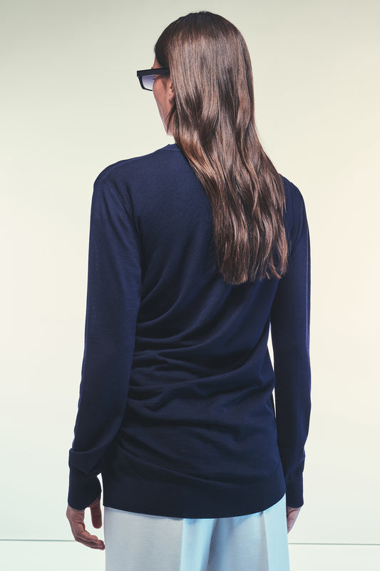 This Liviana Conti sweater brings cozy charm with its extra-fine merino wool knit, featuring a playful drape and a quirky contrast detail on the left side. The elasticated collar and hem add a snug fit that keeps you comfy all day long. Perfect for adding a touch of fun to your chilly-day wardrobe!