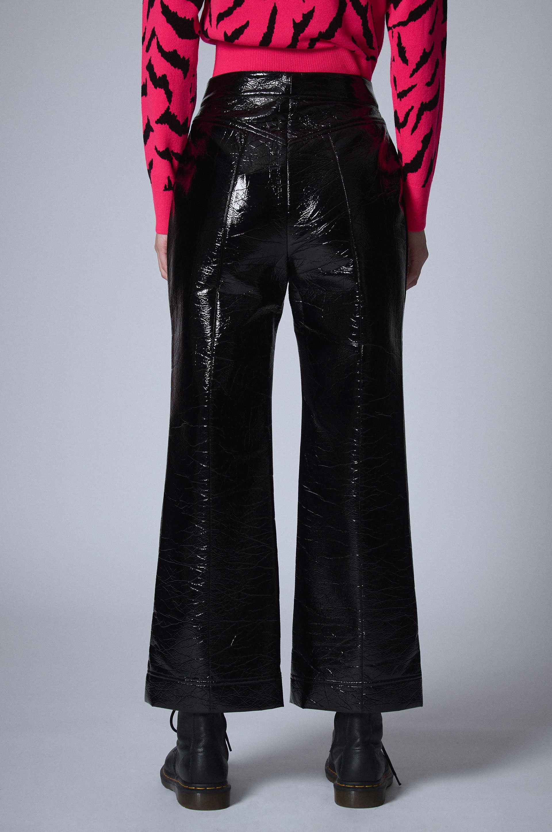 Vinyl trousers. 7/8 cut. Two front pockets. Zip and button fastening at waist.