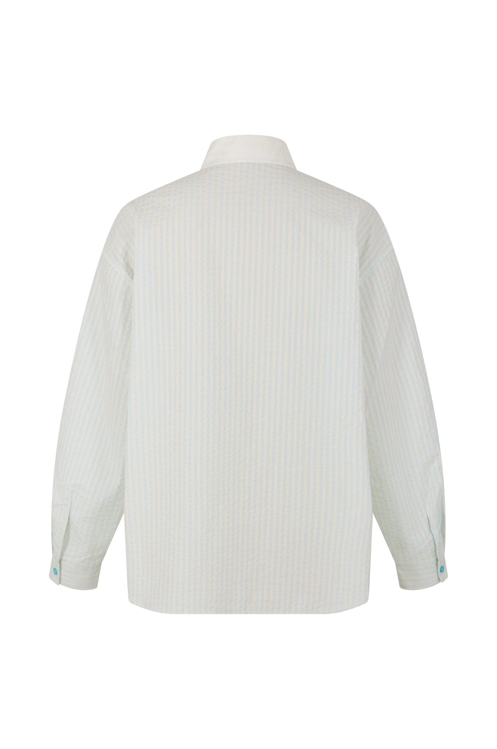 This striped shirt has a classic denim collar and a rose patch on the front. Its loose boy-friend cut gives it a casual chic look.